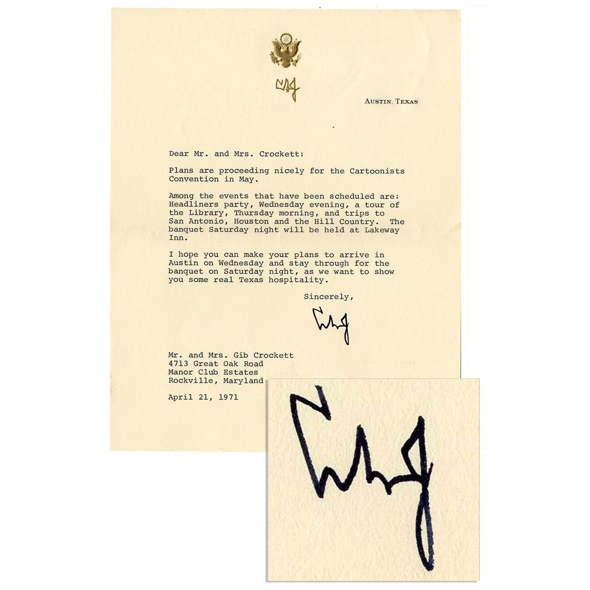 Lyndon B. Johnson typed letter signed, on his personal stationery from Austin, Texas, dated 21 April 1971. Written to cartoonist Gib Crockett, letter reads in part: ''…Plans are proceeding nicely for the Cartoonists Convention in May…I hope you can make your plans to arrive in Austin on Wednesday and stay through for the banquet on Saturday night, as we want to show you some real Texas hospitality…'' Signed ''LBJ'', letter measures 7'' x 9'' on one page. Includes original postmarked envelope. Near fine.