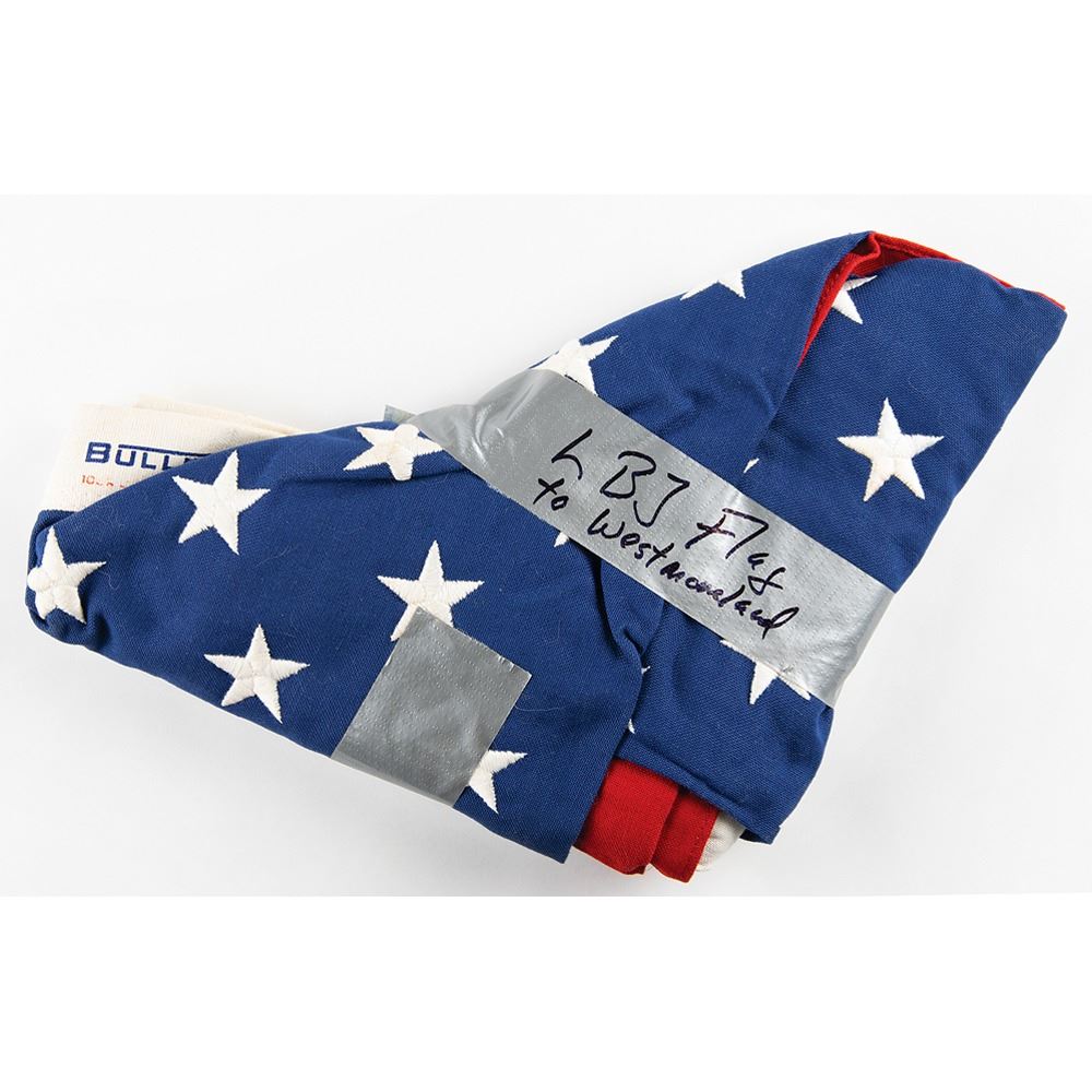 War-dated cotton bunting 5´ x 3´ American flag that was flown over the United States Capitol and presented by President Lyndon B. Johnson to General William Westmoreland, commander of United States forces during the Vietnam War. Included with the flag is a transmittal TLS from President Johnson to Westmoreland and a signed handwritten statement of authenticity from Westmoreland.