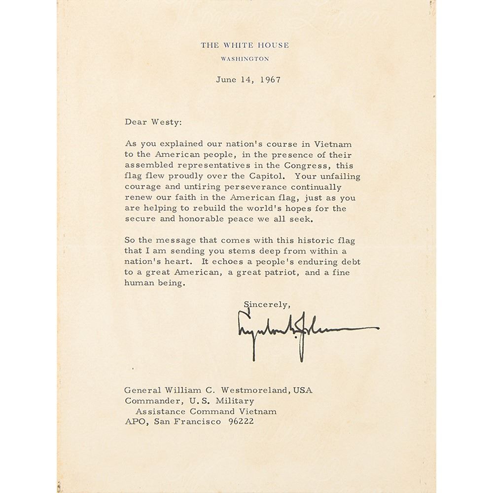 The Johnson letter, one page, 6.75 x 9, White House letterhead, June 14, 1967, addressed to “Westy,†in full: “As you explained our nation’s course in Vietnam to the American people, in the presence of their assembled representatives in the Congress, this flag flew proudly over the Capitol. Your unfailing courage and untiring perseverance continually renew our faith in the American flag, just as you are helping to rebuild the world’s hopes for the secure and honorable peace we all seek. So the message that comes with this historic flag that I am sending you stems deep from within a nation’s heart. It echoes a people’s enduring debt to a great American, a great patriot, and a fine human being.â€