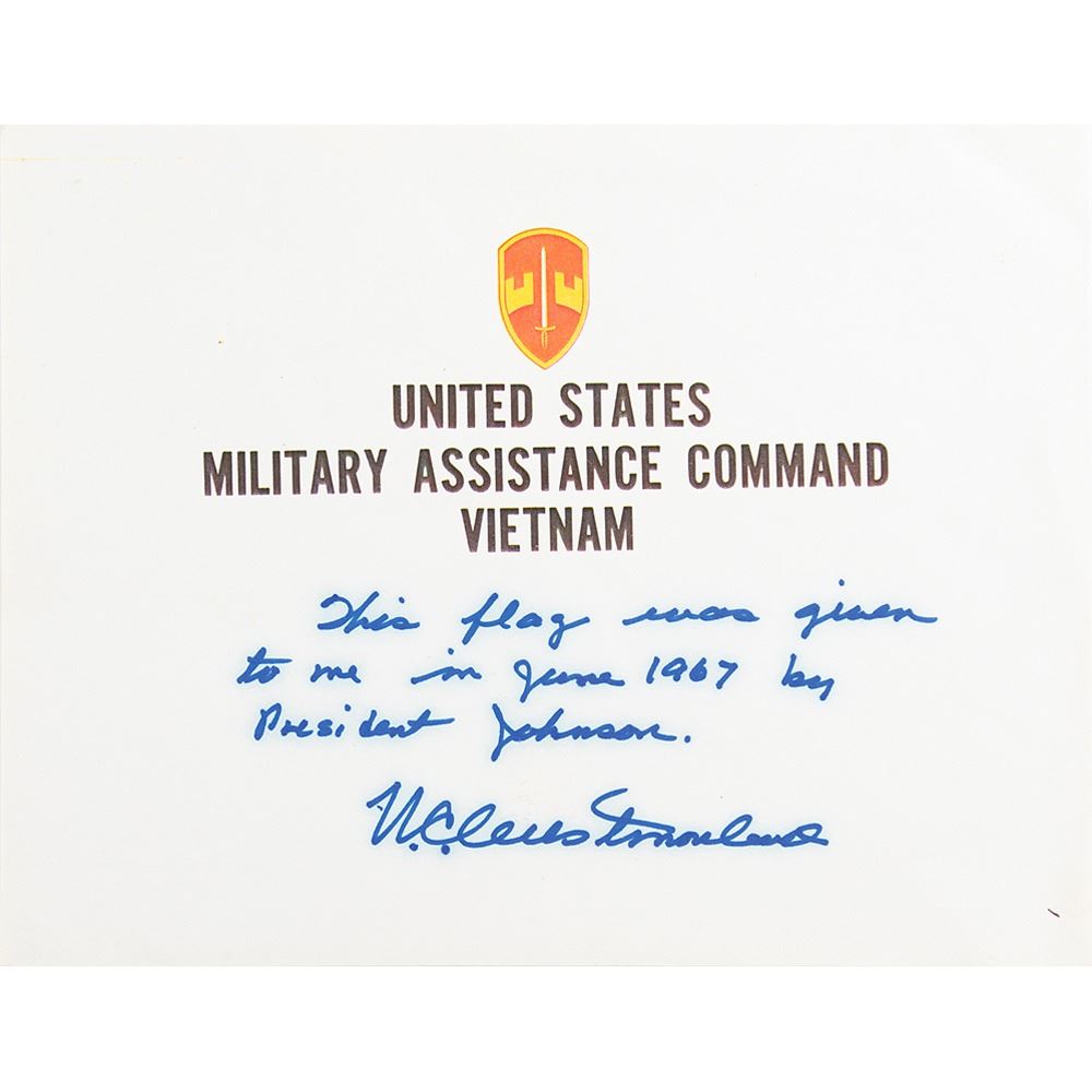 Westmoreland’s handwritten statement, penned in blue felt tip on an 11 x 8.5 sheet printed “United States Military Assistance Command, Vietnam,†in full: “This flag was given to me in June 1967 by President Johnson. W. C. Westmoreland.†In overall fine condition, with overall soiling to the Johnson letter; the flag is wrapped with duct tape and its removal will potentially leave adhesive remnants and oil-based staining; restoration and/or a professional cleaning of the tape residue will in all likelihood be necessary if the tape is removed. Accompanied by Westmoreland’s personal calling card.