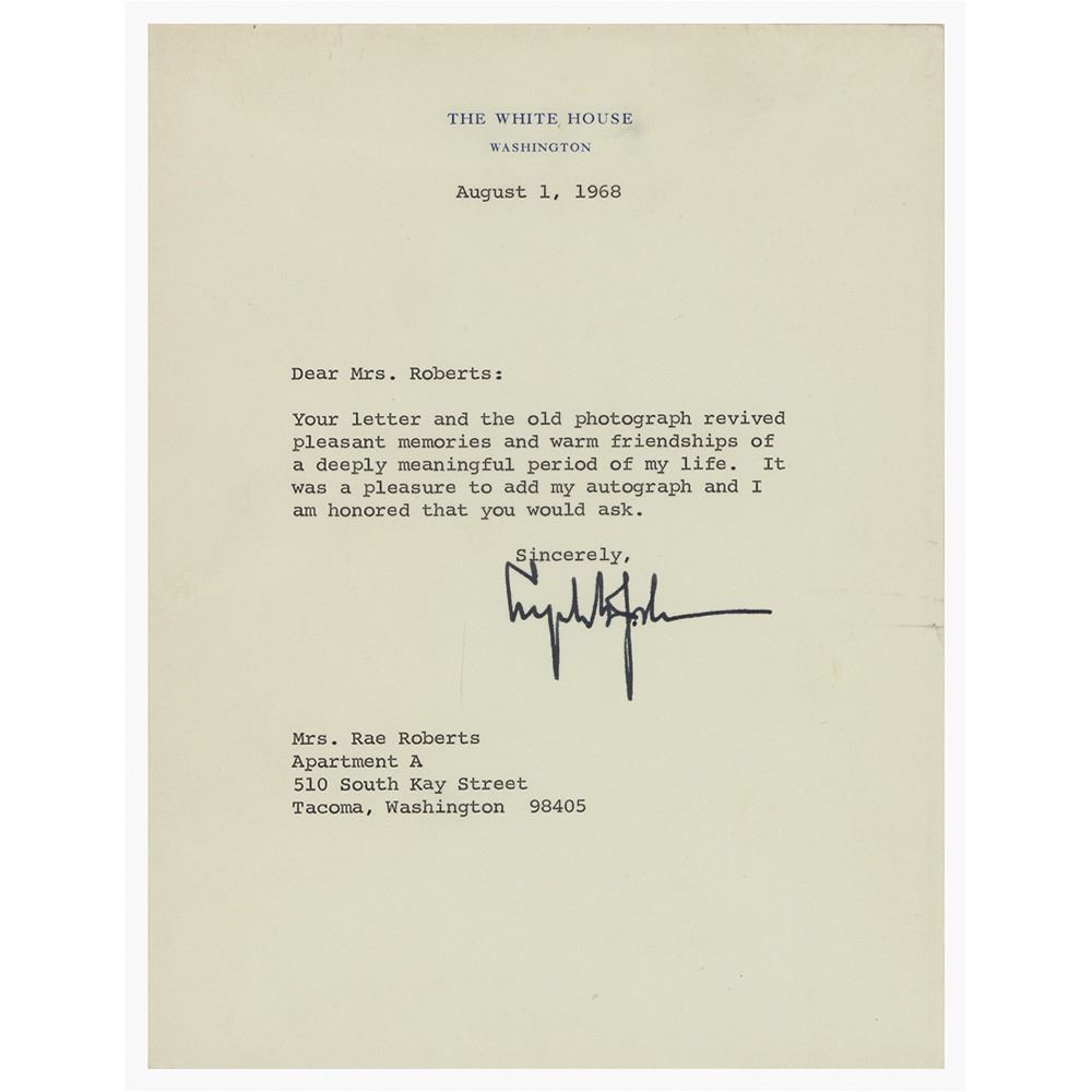 TLS as president, one page, 6.75 x 8.75, White House letterhead, August 1, 1968. Letter to Rae Roberts, in full: "Your letter and the old photograph revived pleasant memories and warm friendship of a deeply meaningful period of my life. It was a pleasure to add my autograph and I am honored that you would ask." In fine condition, with a faint paperclip impression to the right edge.