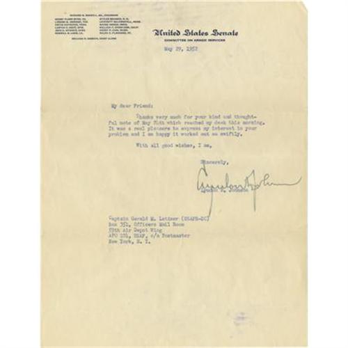 <B>Lyndon B. Johnson Typed Letter Signed as Senator</B></I> “<I>Lyndon B. Johnson</B></I>”. One page, 8” x 10.5”, on United States Senate Committee on Armed Forces letterhead, Washington, May 29, 1952, to Captain Gerald M. Latimer, New York. In this letter Johnson thanks Capt. Latimer for his kind and thoughtful note and writes further “It was a real pleasure to express my interest in your problem and I am happy it worked out so swiftly.” Paper lightly toned, with the usual folds, else a very good bold signature. <BR><BR><b>Shipping:</b> Flat Material, Small (<a target="_blank" href="http://www.heritageauctions.com/common/shipping.php">view shipping information</a>)