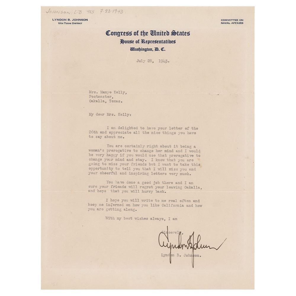 TLS, one page, 8 x 10.5, personal Congress of the United States letterhead, July 28, 1943. Letter to Mamye Kelly, in part: "You are certainly right about it being a woman's prerogative to change her mind and I would be very happy if you would use that prerogative to change your mind and stay. I know that you are going to miss your friends but I want to take this opportunity to tell you that I will miss you and your cheerful and inspiring letters very much. You have done a great job there and I am sure your friends will regret your leaving Oakalla, and hope that you will hurry back. I hope you will write to me real often and keep me informed on how you like California and how you are getting along." In fine condition.