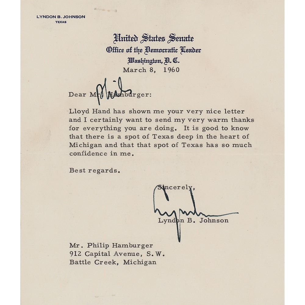 TLS signed “Lyndon,” one page, 6 x 7, United States Senate, Office of the Democratic Leader letterhead, March 8, 1960. Letter to Philip Hamburger, in full: "Lloyd Hand has shown me your very nice letter and I certainly want to send my very warm thanks for everything you are doing. It is good to know that there is a spot of Texas deep in the heart of Michigan and that spot of Texas has so much confidence in me." Johnson writes "Philip" over the formal "Mr. Hamburger" typed salutation. In fine condition, with staple holes to the top edge.