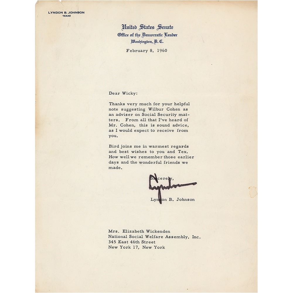 TLS signed “Lyndon,” one page, 8 x 10.5, United States Senate, Office of the Democratic Leader letterhead, February 8, 1960. Letter to Elizabeth Wickenden of the National Social Welfare Assembly, Inc., in part: "Thanks very much for your helpful note suggesting Wilbur Cohen as an adviser on Social Security matters. From all that I've heard of Mr. Cohen, this is sound advice, as I would expect to receive from you. Bird joins me in warmest regards and best wishes to you and Tex." In fine condition, with some light creasing, and a tiny tear to the top edge.