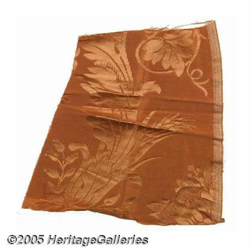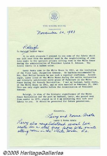 <B>Lyndon B. Johnson White House Salmon Colored Fabric</B></I> Larry Arata joined the White House staff at the invitation of First Lady Jacqueline Bouvier Kennedy in 1961 to work with her on the redecoration of the White House. Arata continued to work through the Johnson administration following his success in upholstering practically every piece of furniture. On White House stationery, a one-page typed letter signed by his widow, Mrs. Norma Arata, shares her insight about the Kennedy and Johnson White House and documents this attractive salmon colored piece of fabric from work on some love seats in the upstairs private sitting room of President Lyndon Baines Johnson. This fabric could be framed with a color White House photo showing the historic love seats. Lot:255
