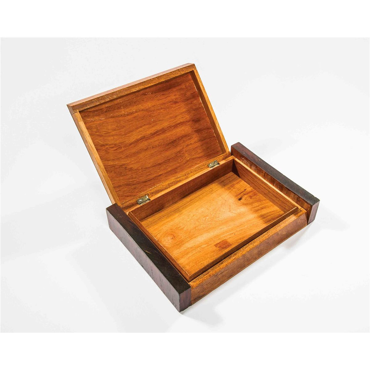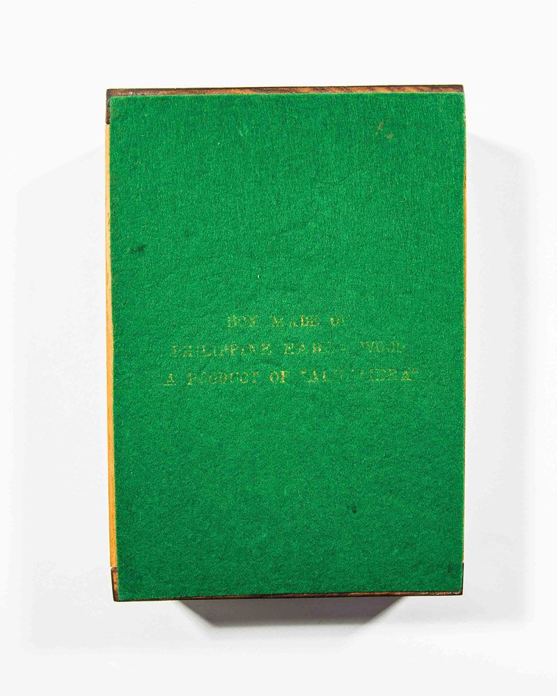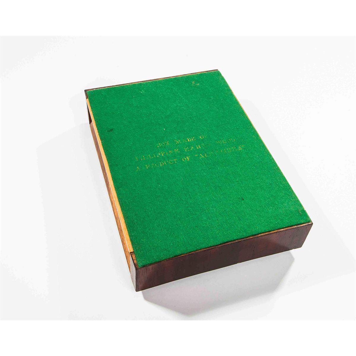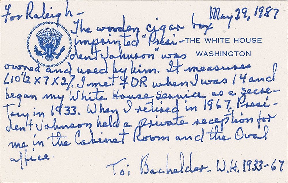 President Johnson’s personally-owned and -used wooden cigar box, measuring 10.25 x 7.25 x 2.25, constructed primarily of light wood with dark accents on the sides, engraved on the top in fine script, “President Johnson.” As would be expected, the wood is of superior, first-class quality. Includes a letter of provenance on a White House card from Toi Bachelder, a White House secretary and member of FDR’s inner circle. In part: “The wooden cigar box imprinted ‘President Johnson’ was owned and used by him…I met FDR when I was 14 and began my White House service as a secretary in 1933. When I retired in 1967, President Johnson held a private reception for me in the Cabinet Room and the Oval Office.” In excellent condition.