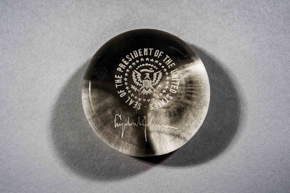 Impressive glass paperweight, measuring 4? in diameter and 1.5? tall, featuring a large presidential seal engraved in the center with President Johnson’s facsimile signature etched below. In fine condition.