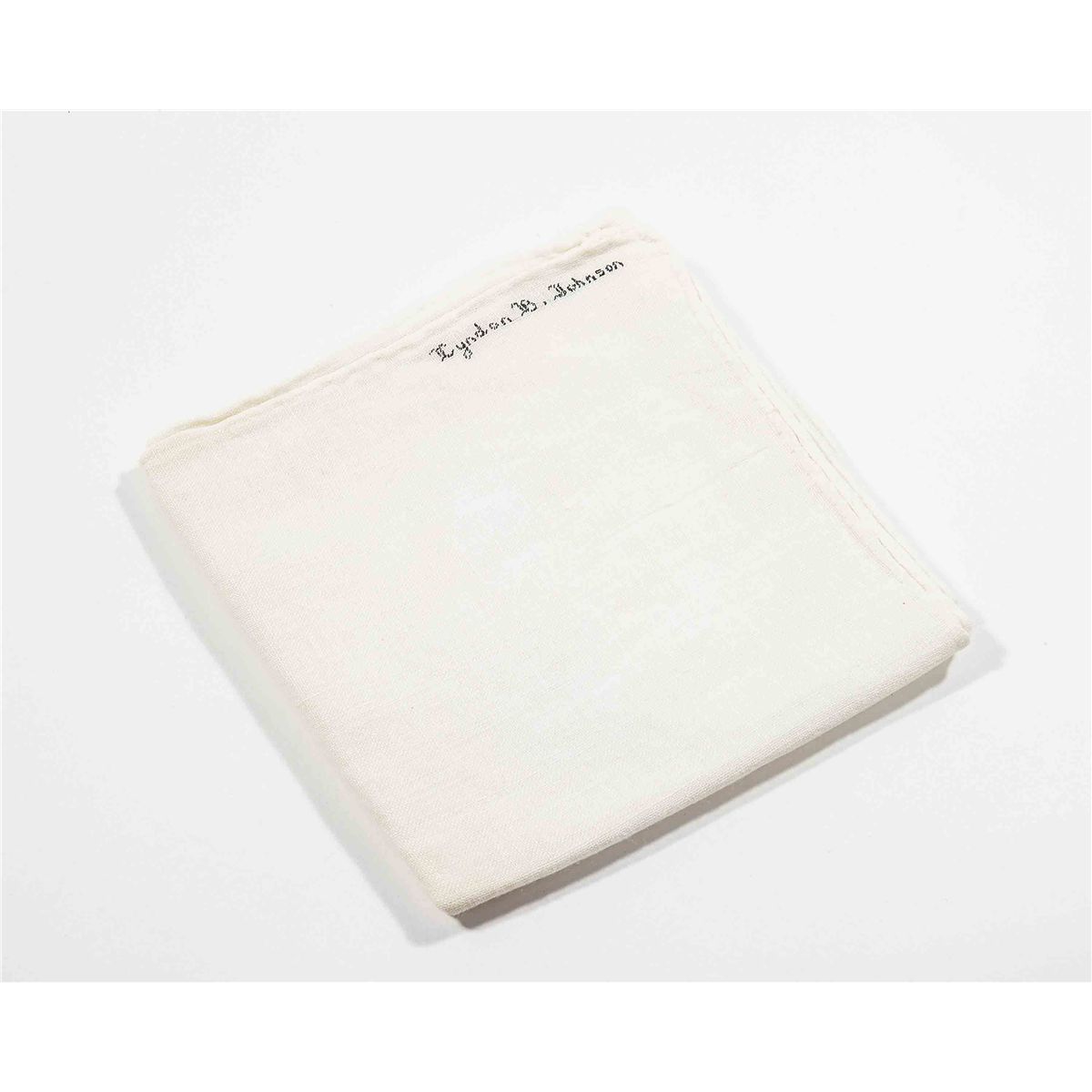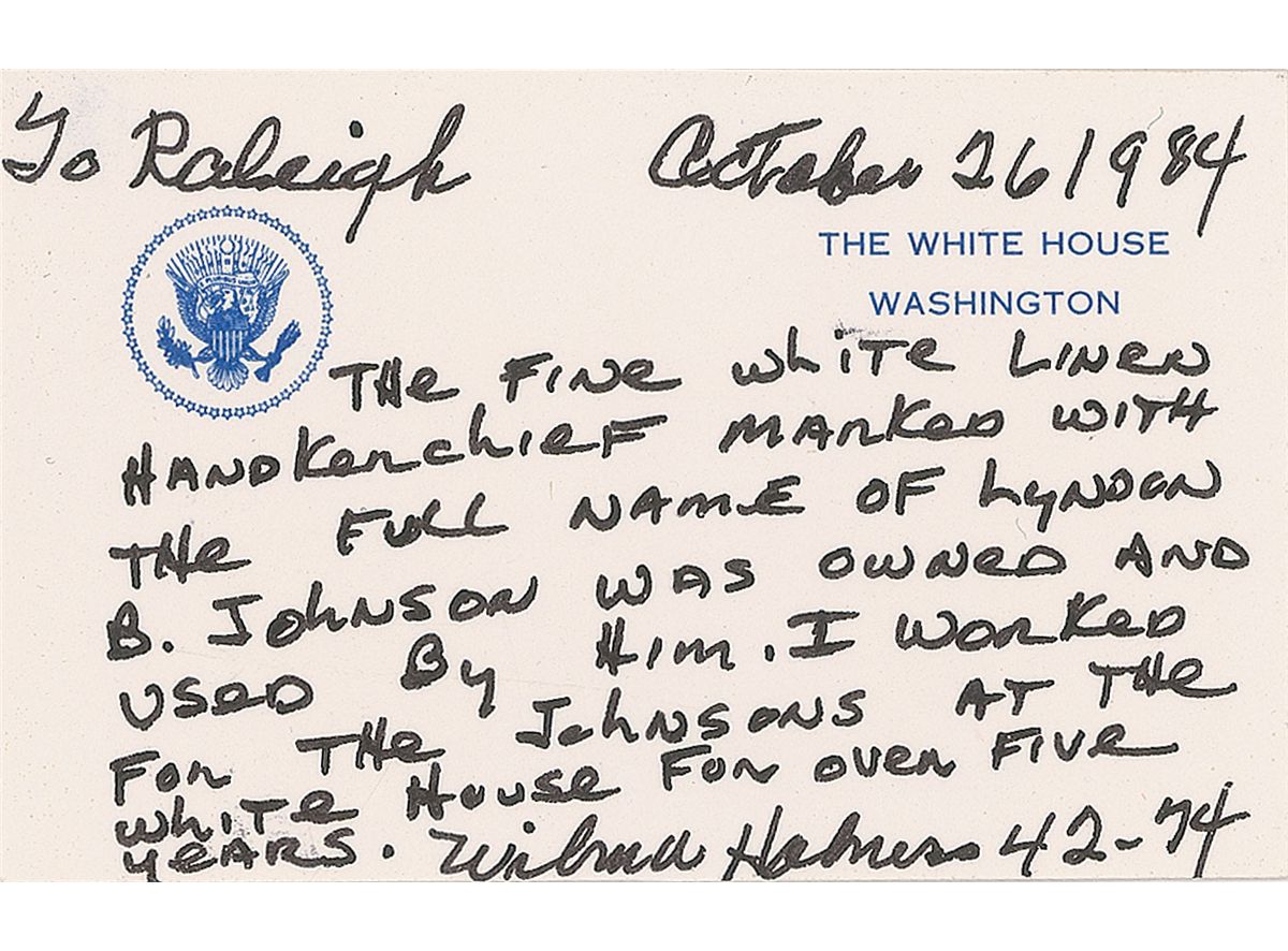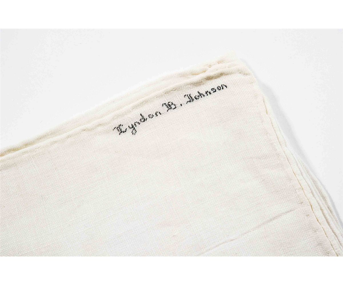 President Johnson’s personally-owned and -used simple off-white linen handkerchief, folded to an overall size of 4.25 x 4.25, expertly embroidered in the corner in dark thread, “Lyndon B. Johnson.” Includes a letter of provenance on a White House card from White House maid Wilma Holness. In full: “The fine white linen handkerchief with the full name of Lyndon B. Johnson was owned and used by him. I worked for the Johnsons at the White House for over five years.” Also accompanied by a photo of Wilma Holness with the handkerchief. Condition is excellent.