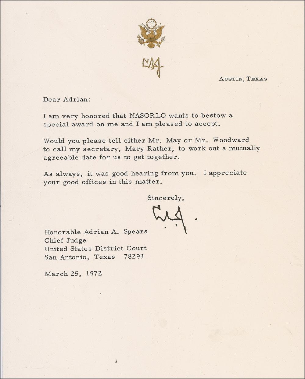TLS signed “L. B. J.,” one page, 7 x 9, personal letterhead, March 25, 1972. Letter to District Court Chief Judge Adrian Spears. In part: “I am very honored that NASORLO [National Association of State Outdoor Recreation Liaison Officers] wants to bestow a special award on me and I am pleased to accept. Would you please tell either Mr. May or Mr. Woodward to call my secretary…to work out a mutually agreeable date for us to get together.” In very fine condition.