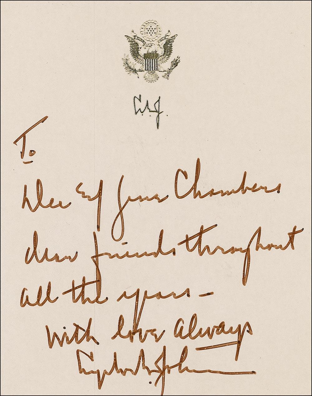 Rare ANS, one page, 3.75 x 4.75, no date. Short note to Jim Chambers, publisher of the Dallas Times Herald, which had won its only Pulitzer Prize in 1964 for the photograph of Jack Ruby shooting Lee Harvey Oswald. In full: “To Dee and Jim Chambers dear friends throughout all the years. With love always Lyndon B. Johnson.” In fine condition, with light vertical line down left side, inherent to the bookplate, through a single letter of signature. Accompanied by a 1972 TLS from Johnson’s secretary, forwarding the bookplate to Chambers’s secretary, as well as the original mailing envelope, and an engraved visiting card, with “Merry Christmas” written at the top in an unknown hand. Johnson is perhaps the rarest of 20th century presidents in handwritten correspondence.