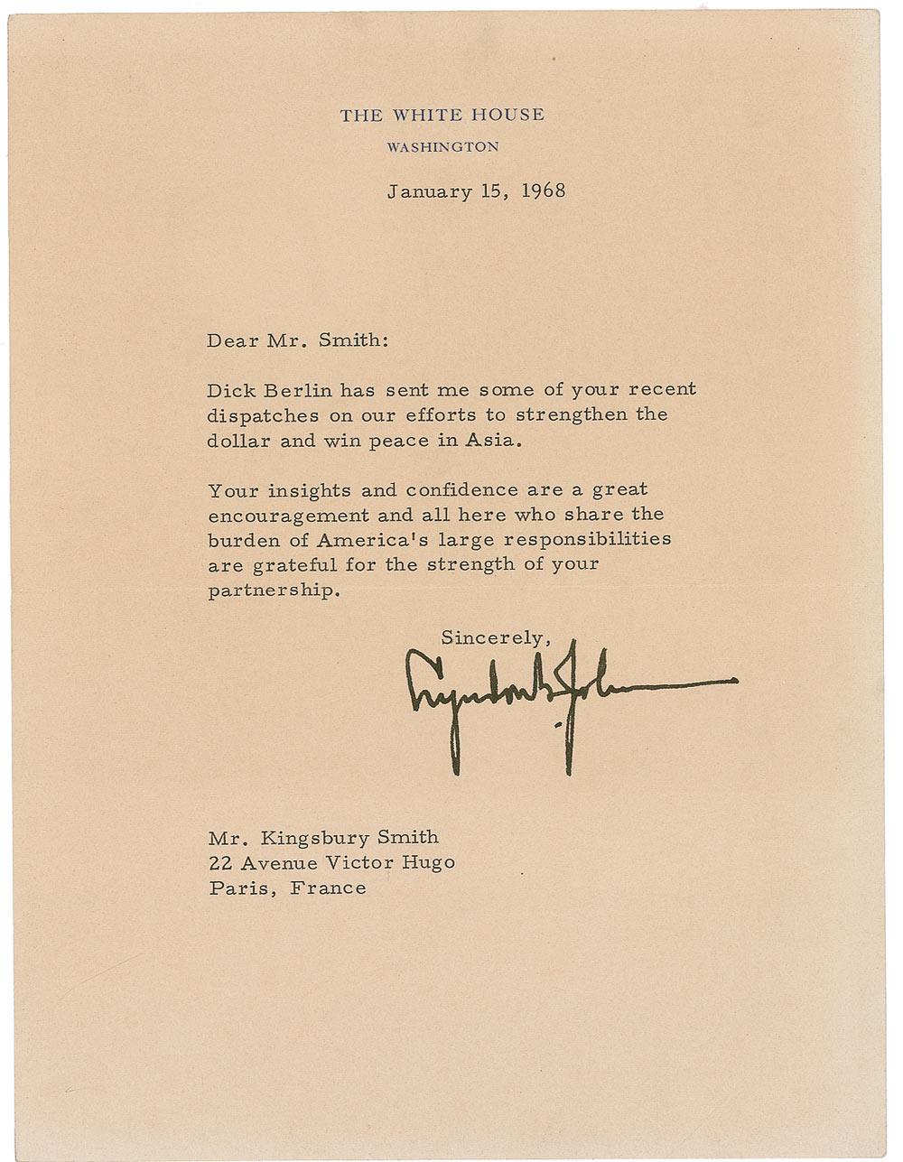 TLS as president, one page, 6.75 x 9, White House letterhead, January 15, 1968. Letter to Joseph Kingsbury-Smith. In full: “Dick Berlin has sent me some of your recent dispatches on our efforts to strengthen the dollar and win peace in Asia. Your insights and confidence are a great encouragement and all here who share the burden of America’s large responsibilities are grateful for the strength of your partnership.” In fine condition, with a uniform shade of toning to the once pale green paper.
