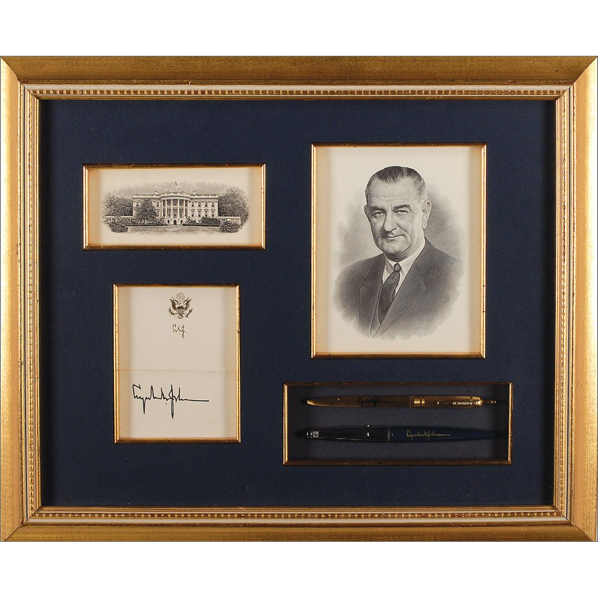 Fountain pen signature, “Lyndon B. Johnson,” on a white 3.25 x 4.5 embossed card. Matted and framed, with a steel engraving photo of Johnson, one of the White House, and two personalized pens, to an overall size of 17.25 x 14.25. In fine condition, with a central horizontal crease and light toning.