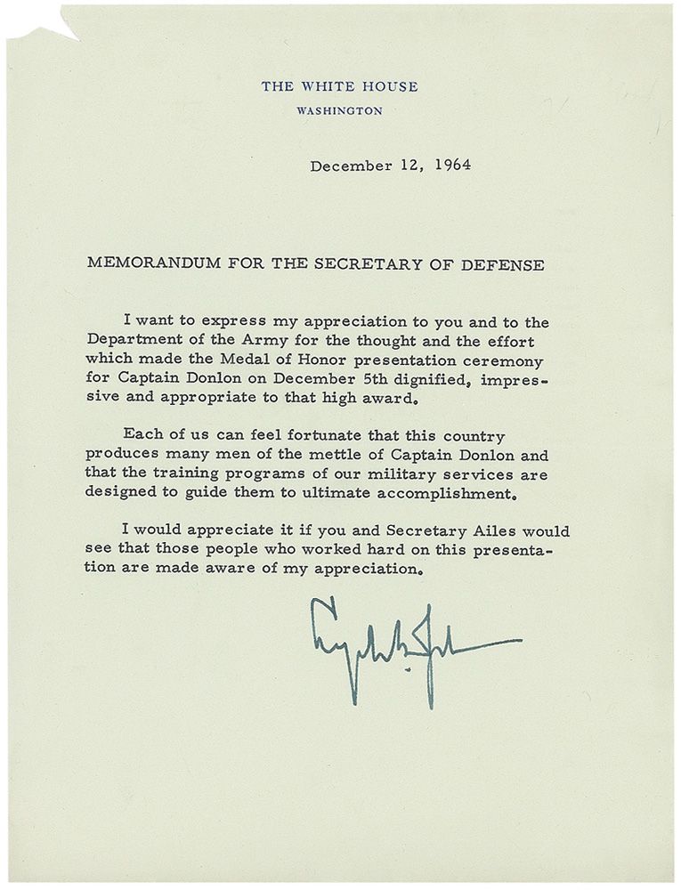 Typed memorandum, as president, one page, 6.75 x 9, White House letterhead, December 12, 1964. Issued to the Secretary of Defense, memo reads, in part: “I want to express my appreciation to you and to the Department of the Army for the thought and effort which made the Medal of Honor presentation ceremony for Captain Donlon on December 5th dignified, impressive and appropriate to that high award. Each of us can feel fortunate that this country produces many men of the mettle of Captain Donlon and that the training programs of our military services are designed to guide them to ultimate accomplishment.” In fine condition, with paper loss to top left corner tip. On December 5, 1964, Capt. Roger Hugh C. Donlon became the first recipient of the Medal of Honor for actions in the Vietnam War for his conduct on July 6, 1964, near Nam Dong, South Vietnam.