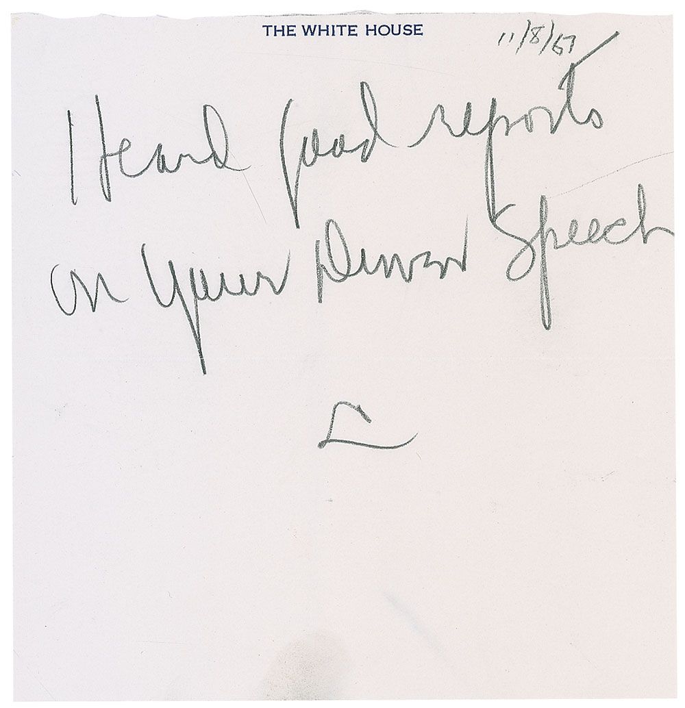 ANS, in pencil, as president signed “L,” one page, 5.25 x 5.5, White House letterhead, dated at the top November 8, 1967, most likely by Robert McNamara. Brief note to his to Secretary of Defense Robert S. McNamara. In full, “Heard good reports on your Dinner Speech.” A central horizontal fold, a rough top edge, and a bit of trivial soiling, otherwise fine condition. Letter originates from the Estate of Robert S. McNamara.