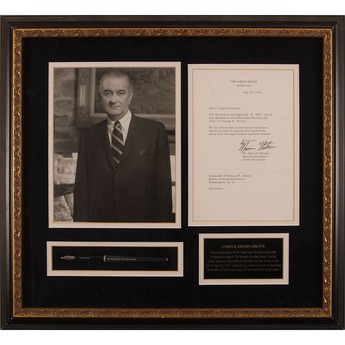 TLS, signed by Johnson’s Special Assistant W. Marvin Watson, one page, 6 x 9, White House letterhead, dated July 12, 1966. Letter to Congresswoman Florence P. Dwyer reads, in full: “The President has signed H. R. 5204, which you sponsored and which provides for the relief of Joseph K. Bellek. He asked that I send the enclosed pen which he used signing this legislation along with his appreciation and best wishes.” The Brooks fountain pen measures 6.25? long with “The President—The White House,” printed in white lettering on the handle. This pen was used in 1966 to sign H. R. 5204 “to Provide for a Proposed System for Retirement of members of the Reserve Forces of the Army of the United States.” Double-matted and framed with a portrait and an informational plaque to an overall size of 20.5 x 19. In fine condition, with a couple light notations to letter.