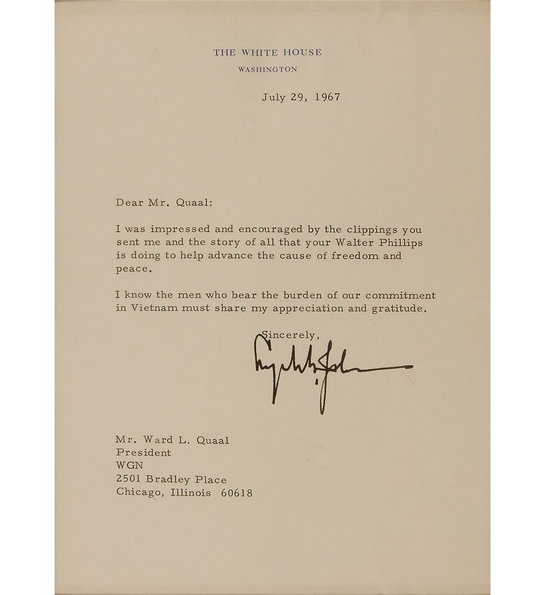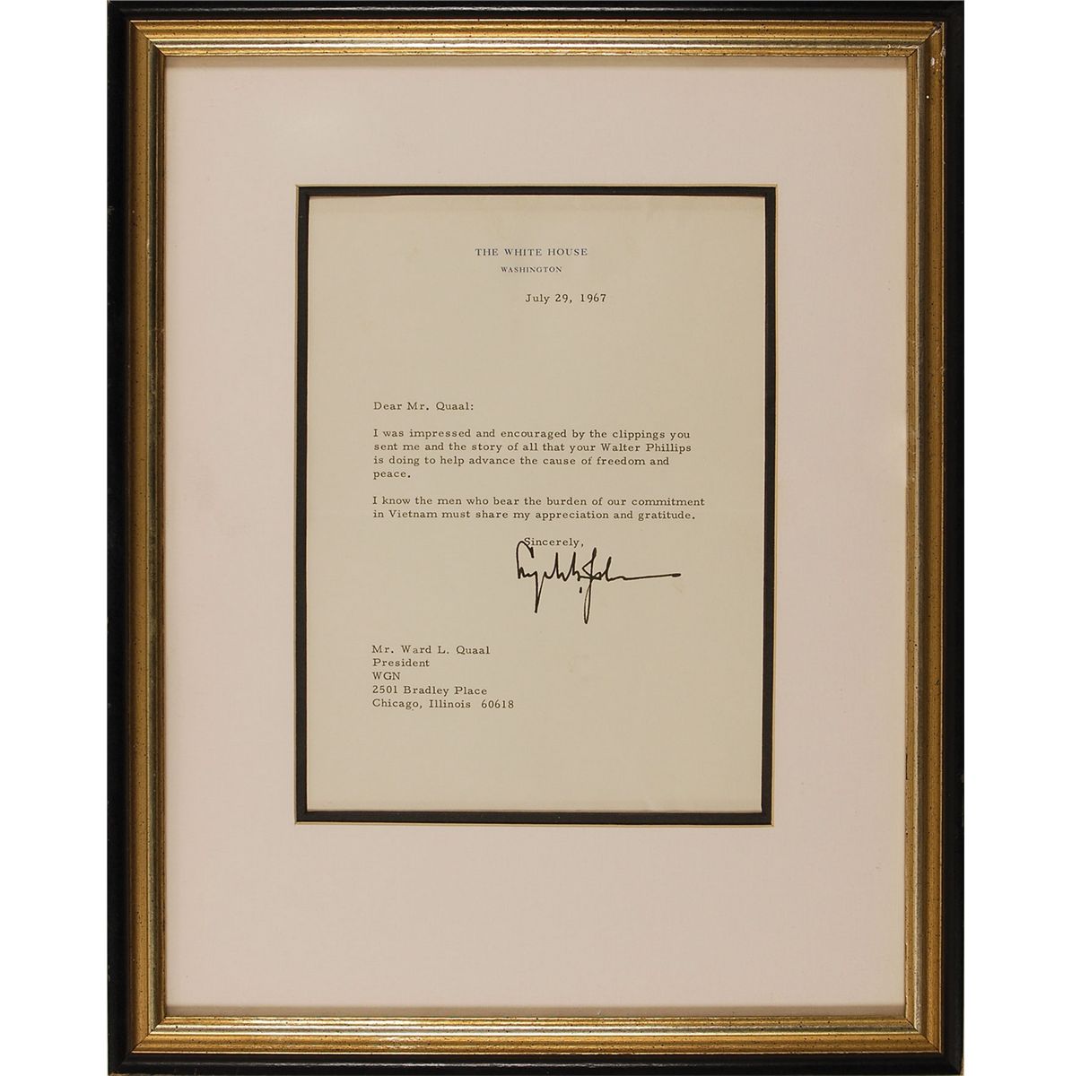 TLS as president, one page, 6.25 x 9, White House letterhead, July 29, 1967. Letter to Ward Quaal at WGN in Chicago. In full: “I was impressed and encouraged by the clippings you sent me and the story of all that your Walter Phillips is doing to help advance the cause of freedom and peace. I know the men who bear the burden of our commitment in Vietnam must share my appreciation and gratitude.” Double-matted and framed to an overall size of 12 x 15. In fine condition, with a couple ripples near top edge.