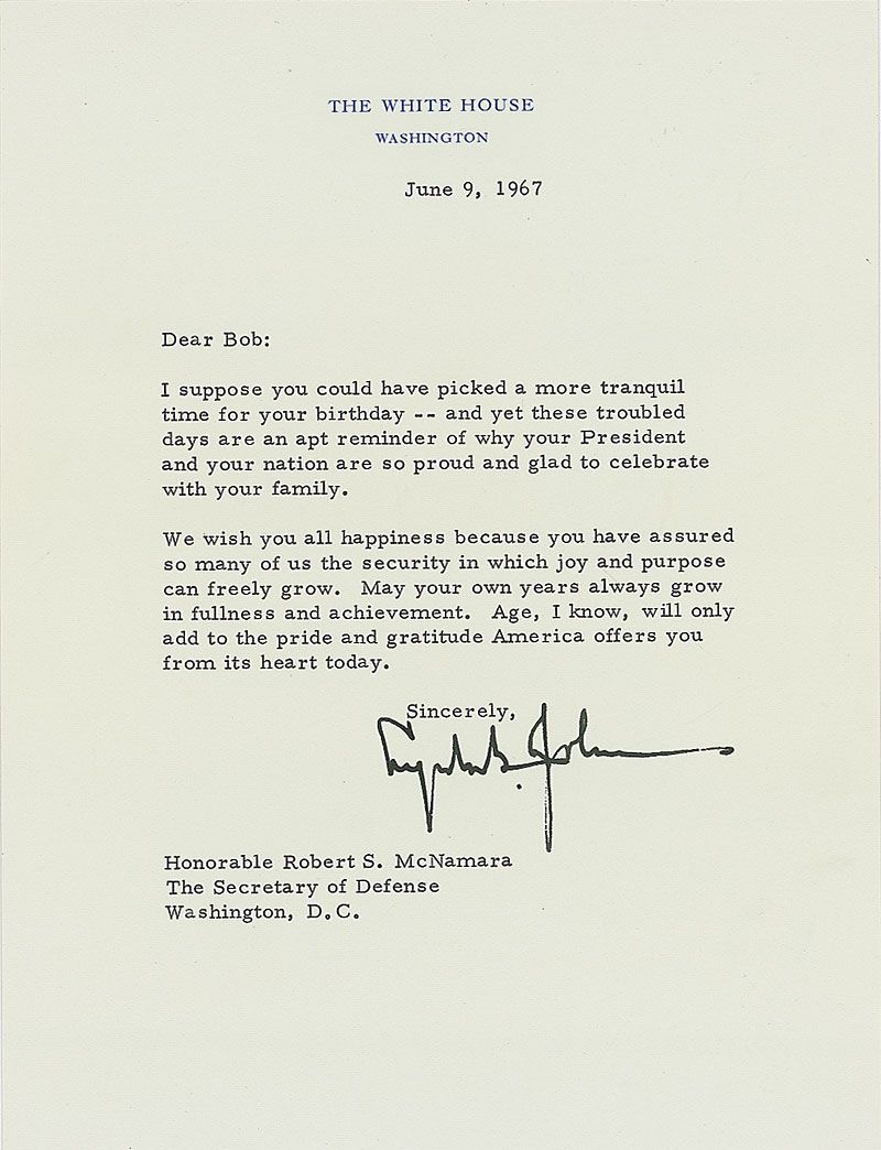 TLS as president, one page, 6.75 x 9, White House letterhead, June 9, 1967. Letter to Secretary of Defense Robert McNamara. In full: “I suppose you could have picked a more tranquil time for your birthday—and yet these troubled days are an apt reminder of why your President and your nation are so proud and glad to celebrate with your family. We wish you all happiness because you have assured so many of us the security in which joy and purpose can freely grow. May your own years always grow in fullness and achievement. Age, I know, will only add to the pride and gratitude America offers you from its heart today.” In very fine condition. Letter originates from the Estate of Robert S. McNamara.
