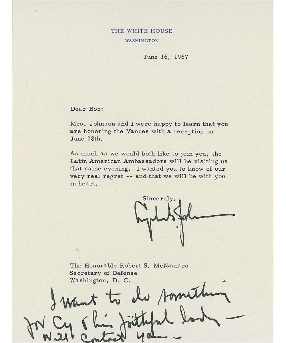 TLS as president, one page, 6.75 x 9, White House letterhead, June 16, 1967. Letter to Secretary of Defense Robert McNamara. In part: “Mrs. Johnson and I were happy to learn that you are honoring the Vances with a reception on June 28th. As much as we would both like to join you, the Latin American Ambassadors will be visiting us that same evening.” Under his signature, Johnson adds a boldly penned postscript which reads, “I want to do something for Cy & his faithful lady–Will Contact you—.” In fine condition. Letter originates from the Estate of Robert S. McNamara.