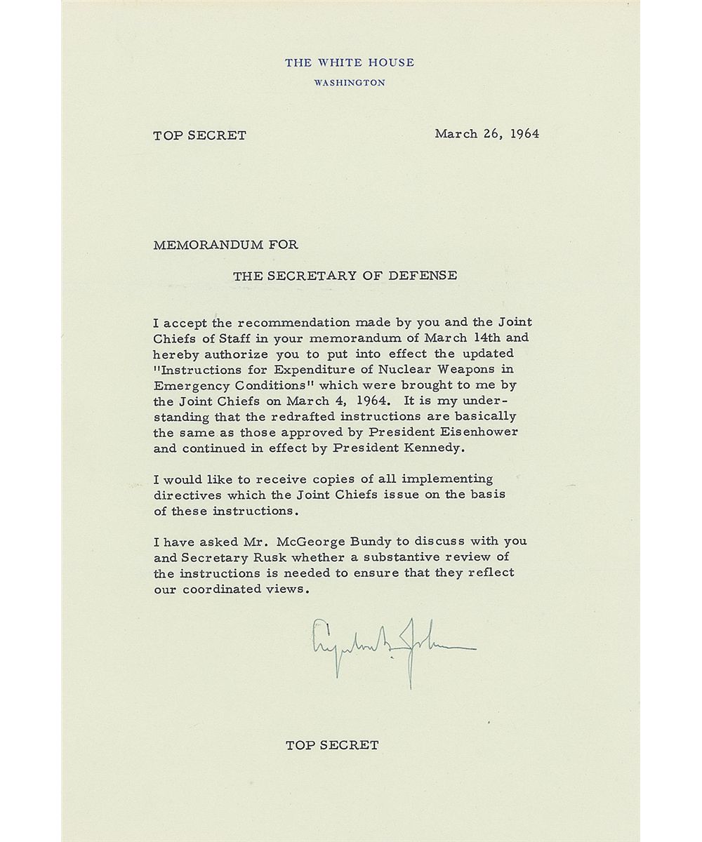 Typed memorandum, as president, one page, 6.75 x 9, White House letterhead, March 26, 1964. Issued to the Secretary of Defense, memo reads, in part: “I accept the recommendation made by you and the Joint Chiefs of Staff in your memorandum of March 14th and hereby authorize you to put into effect the updated ‘Instructions for Expenditure of Nuclear Weapons in Emergency Conditions’ which were brought to me by the Joint Chiefs of Staff on March 4, 1964. It is my understanding that the redrafted instructions are basically the same as those approved by President Eisenhower and continued in effect by President Kennedy. I would like to receive copies of all implementing directives which the Joint Chiefs issue on the basis of these instructions.” In fine condition.