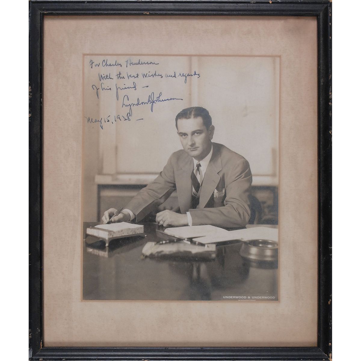 Very early vintage matte-finish 7 x 9 Underwood and Underwood photo of a 30-year-old Johnson seated at his desk, signed and inscribed in fountain pen “For Charles Henderson, With the best wishes and regards of his friend—Lyndon B. Johnson, May 15, 1938.” Matted and framed, in its original frame, to an overall size of 10.75 x 12.75. In fine condition, with a light brush to a single word of inscription and some toning to mat. At the time of the photo, Johnson was representing Texas’s 10th congressional district in Washington, DC. He became a close ally to President Roosevelt, who quickly appointed him to the Naval Affairs Committee. Such early portraits from Johnson’s fledgling political career are quite uncommon.