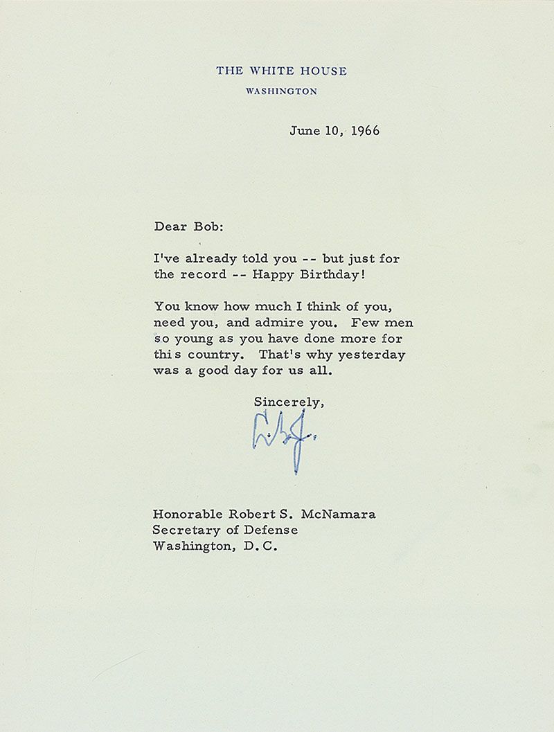 TLS as president signed “L. B. J.,” 6.75 x 9, White House letterhead, June 10, 1966. Letter to Secretary of Defense Robert McNamara. In full: “I’ve already told you—but just for the record—Happy Birthday! You know how much I think of you, need you, and admire you. Few men so young as you have done more for this country. That’s why yesterday was a good day for us all.” In fine condition. On this day, McNamara was extensively questioned by all 10 Senate Committee Chairmen about NATO and South Vietnam. Letter originates from the estate of Robert S. McNamara.