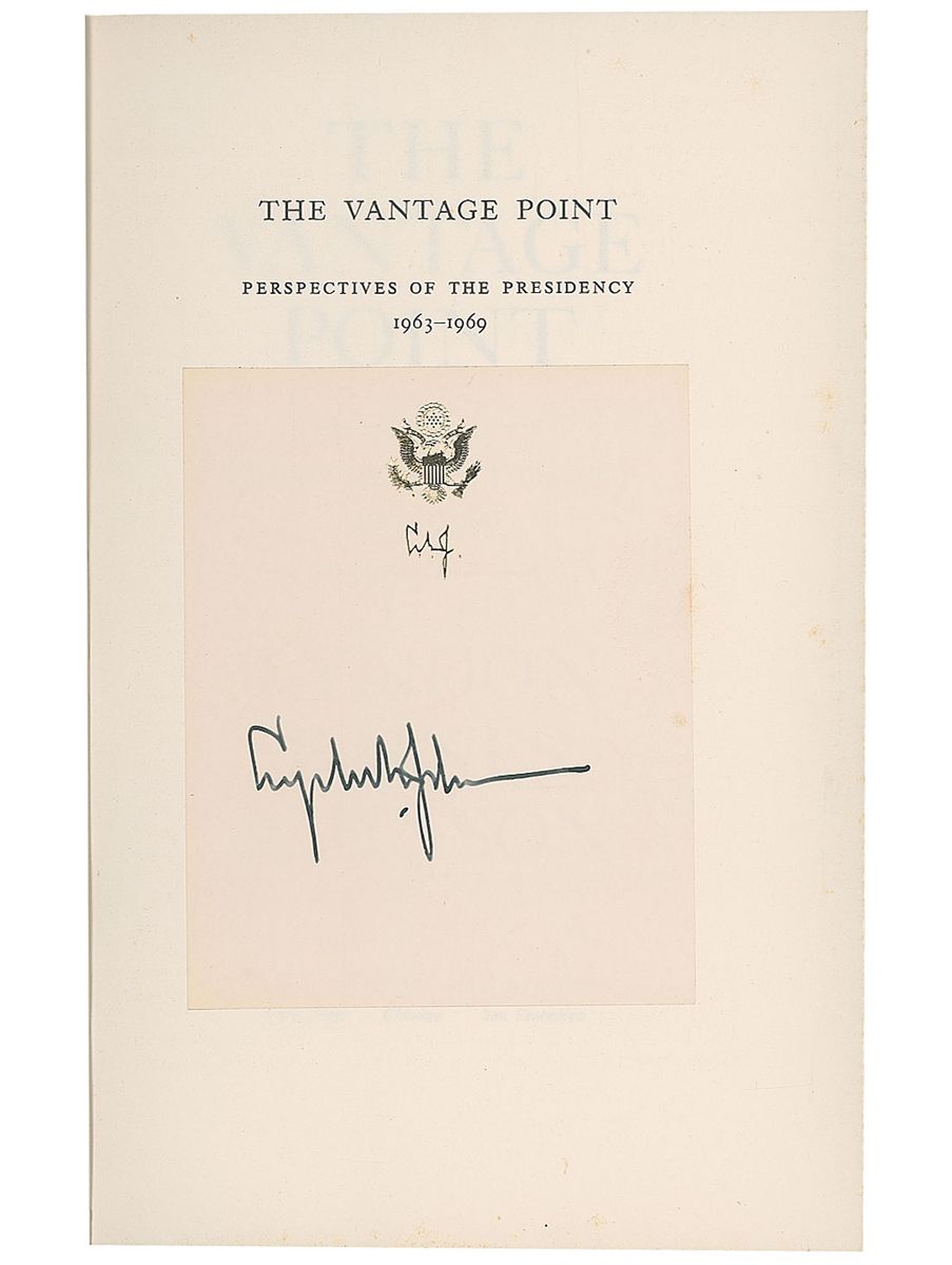 Signed book: The Vantage Point. First edition. NY: Holt, Rinehart, and Winston, 1971. Hardcover with dust jacket, 6.5 x 9.5, 636 pages. Signed in black ink on a bookplate affixed to the half-title page. Some spotting and toning to fore-edges, and some creasing, small tears, and foxing to dust jacket, otherwise fine condition.