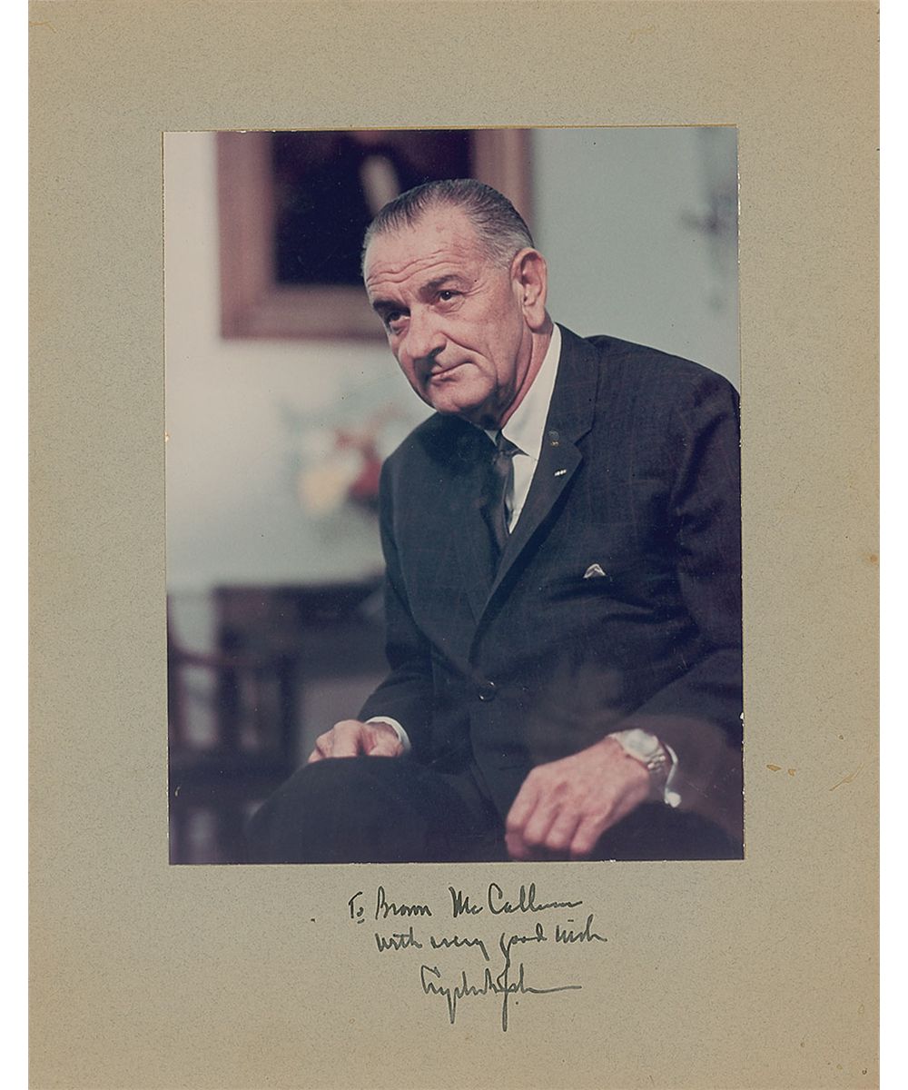 Distinguished color vintage glossy 7.25 x 9.25 photo of Johnson affixed to an 11 x 14 mount, signed and inscribed on the mount in fountain pen, “To Brown McCullum, with every good wish, Lyndon B. Johnson.” In fine condition, with a few tiny spots of staining to the right side of the mount.