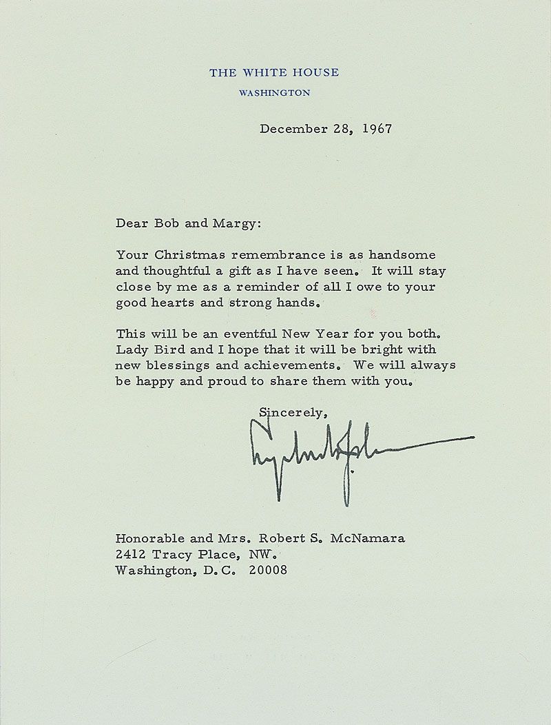 TLS as president, one page, 6.75 x 9, White House letterhead, December 28, 1967. Letter to Mr. and Mrs. Robert McNamara. In full: “Your Christmas remembrance is as handsome and thoughtful a gift as I have seen. It will stay close by me as a reminder of all I owe to your good hearts and strong hands. This will be an eventful New Year for you both. Lady Bird and I hope that it will be bright with new blessings and achievements. We will always be happy and proud to share them with you.” In fine condition. Letter originates from the Estate of Robert S. McNamara.