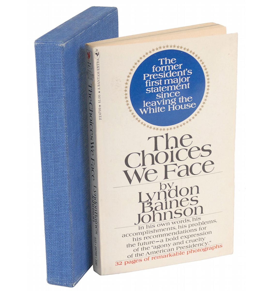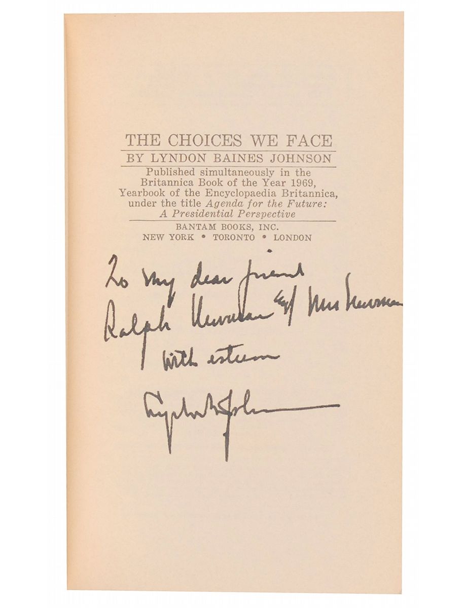 Signed book: The Choices We Face. Bantam edition published March 1969. NY: Bantam Books, 1969. Softcover, 4.25 x 7, 151 pages. Signed and inscribed on the title page in black ink, “To my dear friends Ralph Newman & Mrs. Newman, With esteem, Lyndon B. Johnson.” In fine condition. Accompanied by a slipcase.