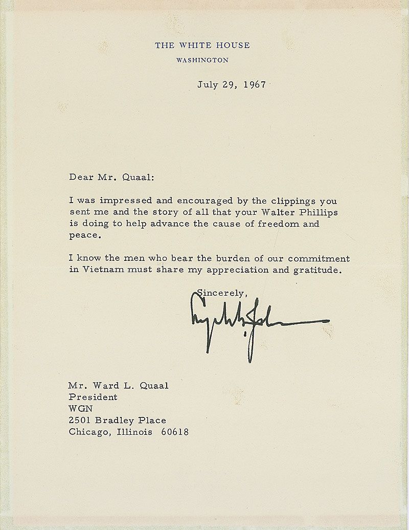TLS as president, one page, 6.5 x 9, White House letterhead, July 29, 1967. Ward L. Quaal, President, WGN, Chicago. In full: “I was impressed and encouraged by the clippings you sent me and the story of all that your Walter Phillips is doing to help advance the cause of freedom and peace. I know the men who bear the burden of our commitment in Vietnam must share my appreciation and gratitude.” Show-through from adhesive remnants along reverse edges, otherwise fine condition.