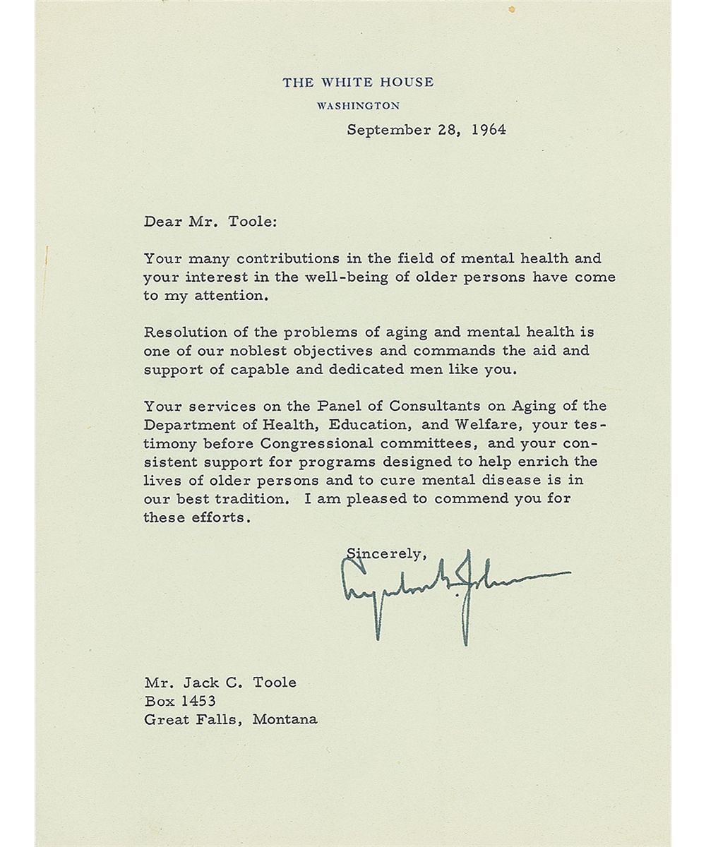 TLS as president, one page, 6.75 x 9, White House letterhead, September 28, 1964. Letter of commendation reads, in part: “Your many contributions in the field of mental health and your interest in the well-being of older persons has come to my attention. Resolution of the problems of aging and mental health is one of our noblest objectives and commands the aid and support of capable and dedicated men like you. Your services on the Panel of Consultants on Aging…your testimony before Congressional committees, and your consistent support for programs designed to help enrich the lives of older persons and to cure mental disease is in our best tradition. I am pleased to commend you for these efforts.” In fine condition.