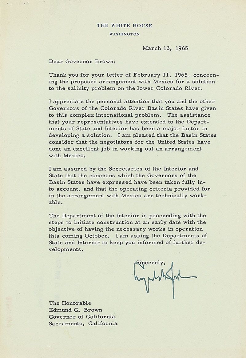 TLS as president, one page, 7 x 10.25, White House letterhead, March 13, 1965. Letter to Governor Edmund G. Brown of California. In part: “Thank you for your letter…concerning the proposed arrangement with Mexico for a solution to the salinity problem on the lower Colorado River. I appreciate the personal attention that you and the other Governors of the Colorado River Basin States have given to this complex international problem…The Department of the Interior is proceeding with the steps to initiate construction at an early date.” In fine condition, with unobtrusive staple holes to the upper left and mild show-through from a governor’s office stamp to the reverse.