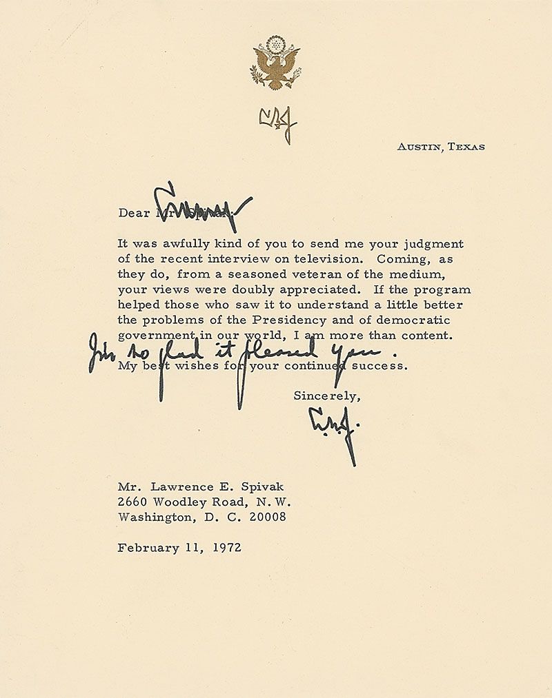 TLS signed “L. B. J.,” one page, 7 x 8.75, personal letterhead, February 11, 1972. Letter to Lawrence E. Spivak of Meet the Press. In part: “It was awfully kind of you to send me your judgment of the recent interview on television. Coming, as they do, from a seasoned veteran of the medium, your views were doubly appreciated. If the program helped those who saw it to understand a little better the problems of the Presidency and of democratic governments in our world, I am more than content.” At the conclusion, Johnson adds in his own hand: “I’m so glad it pleased you.” In fine condition. Accompanied by the original mailing envelope bearing a printed free frank, and Spivak’s retained carbon copy of his initial letter, telling LBJ that the interview was one of the “most fascinating and revealing” that he had ever seen.