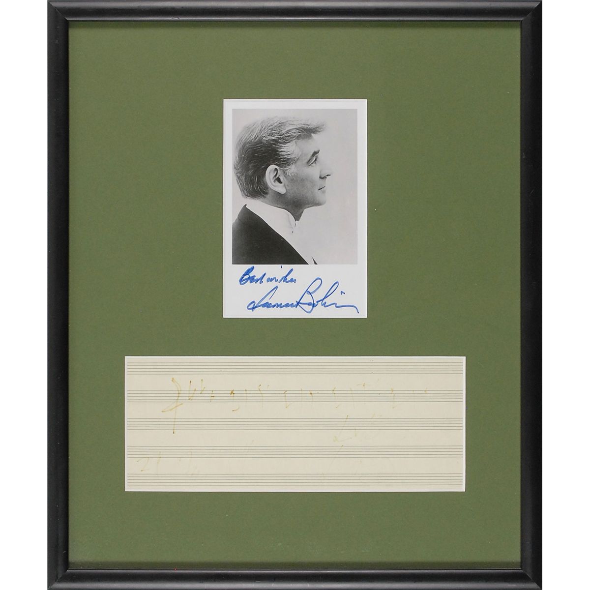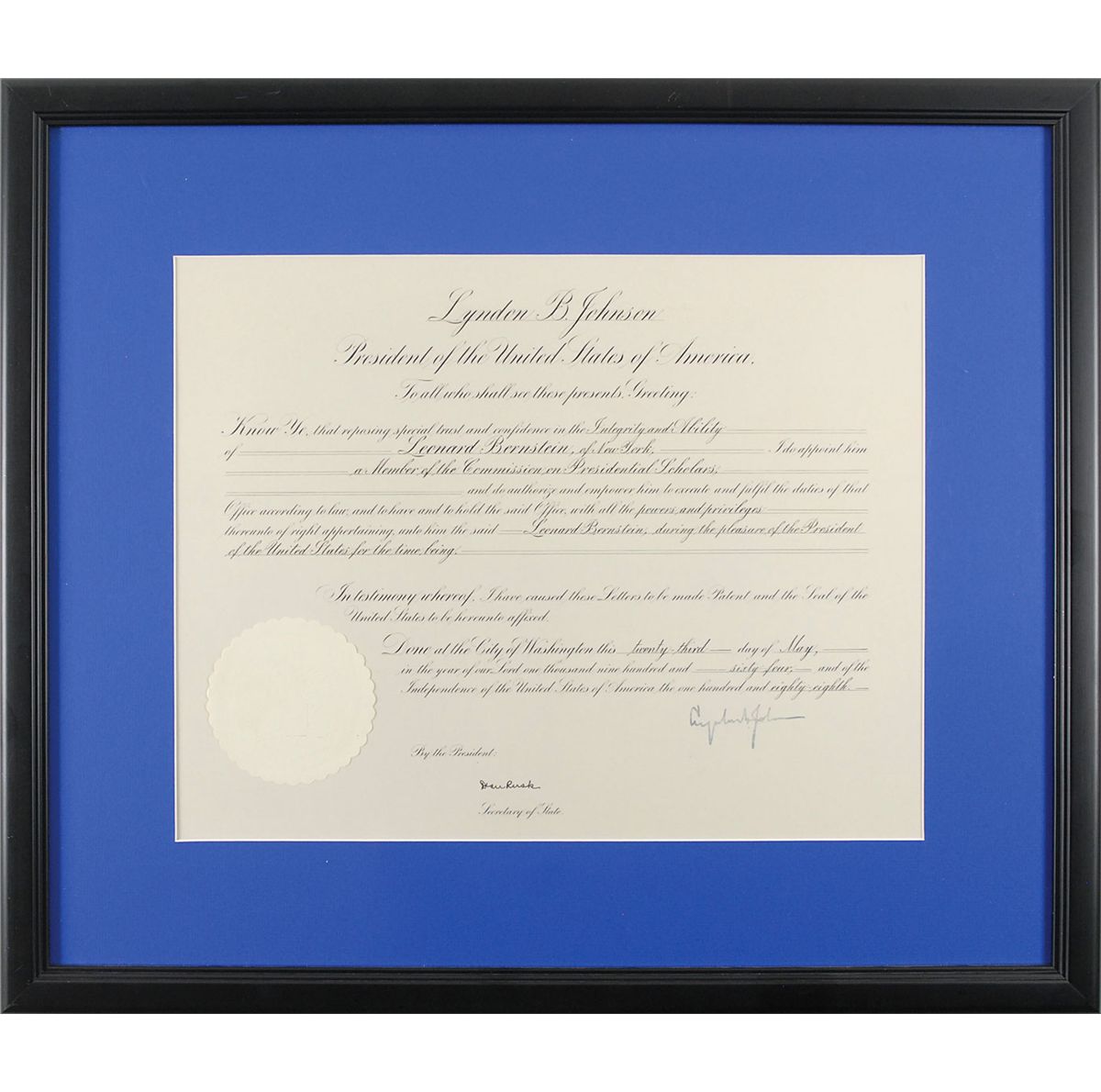 Partly-printed DS as president, one page, 16.25 x 12.75, May 23, 1964. President Johnson appoints the acclaimed composer and conductor Leonard Bernstein, of New York, as “a Member of the Commission on Presidential Scholars.” Nicely signed at the conclusion by Johnson and countersigned by Secretary of State Dean Rusk. Matted and framed to an overall size of 24 x 20. The embossed white paper seal affixed to the lower left remains crisp and fully intact. In fine condition. In 1964, by executive order, President Johnson established the United States Presidential Scholars Program to foster excellence and recognize outstanding high school seniors. Bernstein’s national stature as a force in education grew out of his popular ‘Young People’s Concerts’ series begun in 1958, which set out to increase young people’s interest in and enjoyment of music. An excellent connection between the arts and politics, and association between American icons. Accompanied by a glossy 3 x 5 photo signed in black felt tip by Bernstein and a faded Bernstein AMQS, framed together to an overall size of 12 x 14.