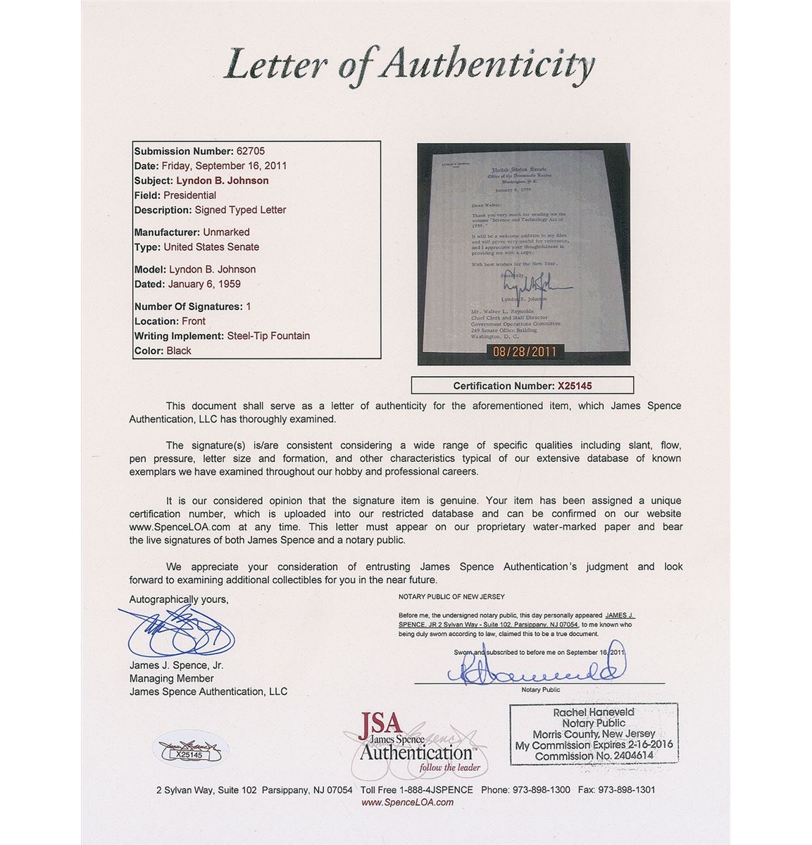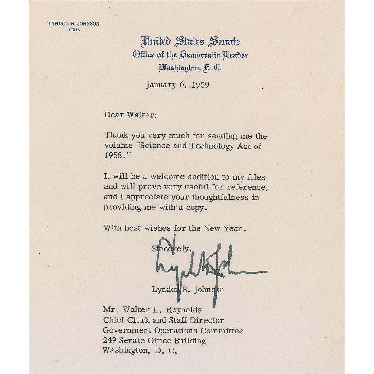 TLS, one page, 6 x 7, United States Senate letterhead, January 6, 1959. In full: “Thank you very much for sending me the volume ‘Science and Technology Act of 1958.’ It will be a welcome addition to my files and will prove very useful for reference, and I will appreciate your thoughtfulness in providing me with a copy.” Trimmed edges and a faint paperclip impression to top edge, otherwise fine condition. Accompanied by a full letter of authenticity from James Spence.