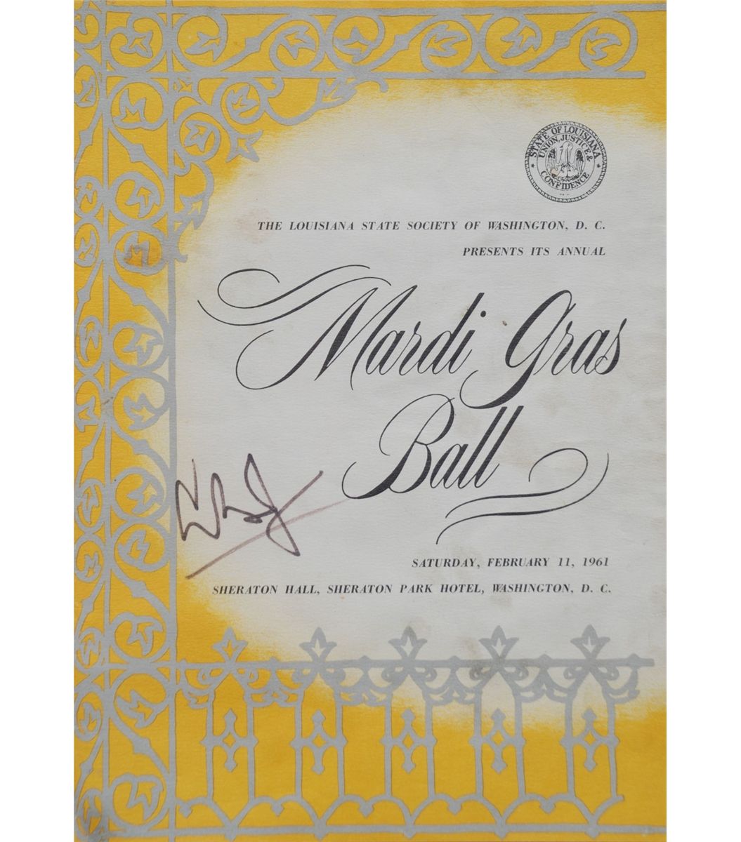 Program signed. On the program for the Louisiana State Society of Washington, D. C. Mardi Gras Ball February 11, 1961, then Vice President boldly signs “LBJ” in large letters with a felt pen. Signature was personally obtained by the consignor.