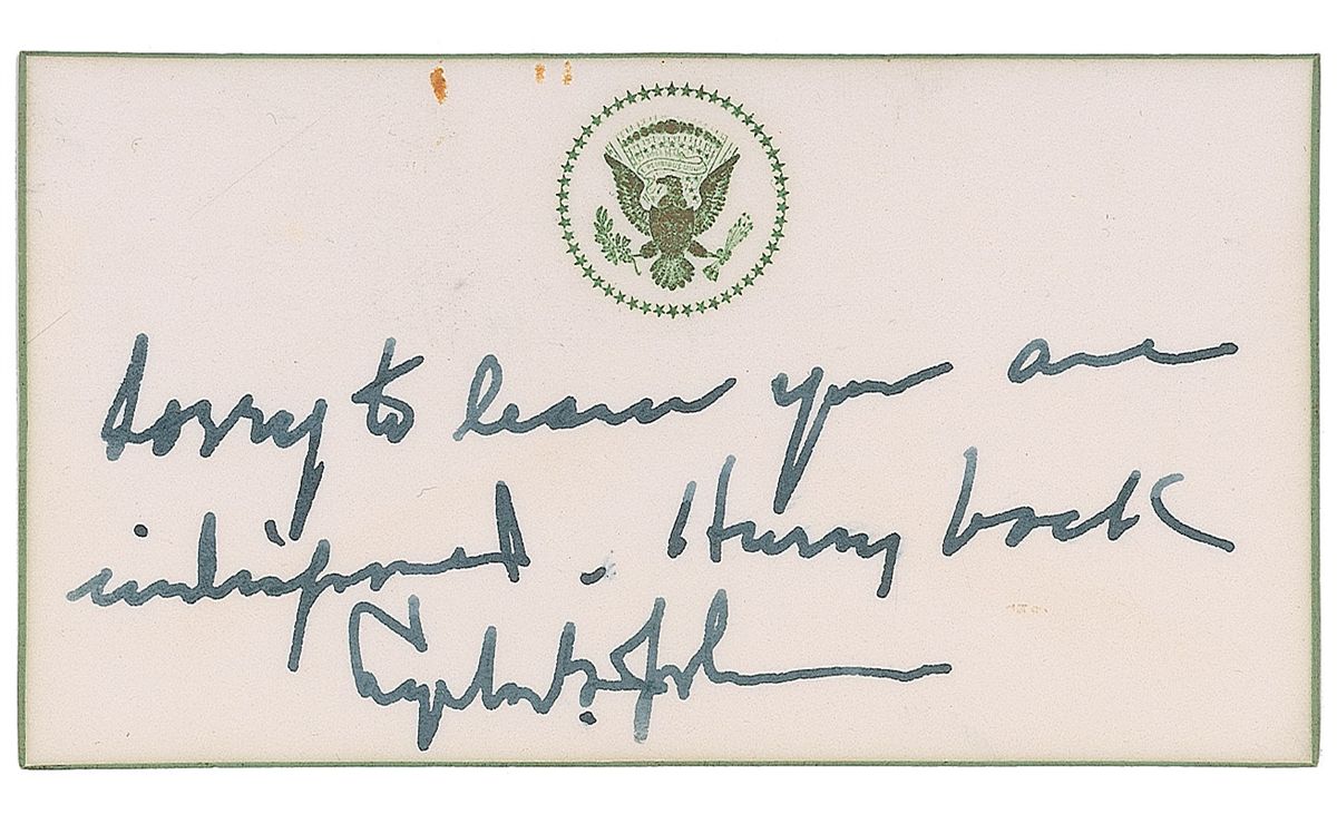 Scarce ANS signed “Lyndon B. Johnson,” one page on a 4.25 x 2.25 stationery card embossed with the presidential seal, no date. Brief note offering good wishes. In full: “Sorry to hear you are indisposed. Hurry back.” In very good condition, with oxidation to the gilt-stamped seal and gilt edges, and traces of a rusty paperclip mark to the top. Accompanied by the original transmittal envelope, which bears a matching embossed seal on the flap.