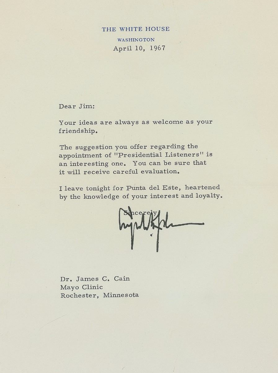 TLS as president, one page, 6.75 x 8.75, White House letterhead, April 10, 1967. Letter to President Johnson’s personal physician, James C. Cain, in full: “Your ideas are always as welcome as your friendship. The suggestion you offer regarding the appointment of ‘Presidential Listeners’ is an interesting one. You can be sure that it will receive careful evaluation. I leave tonight for Punta del Este, heartened by the knowledge of your interest and loyalty.” In fine condition.
