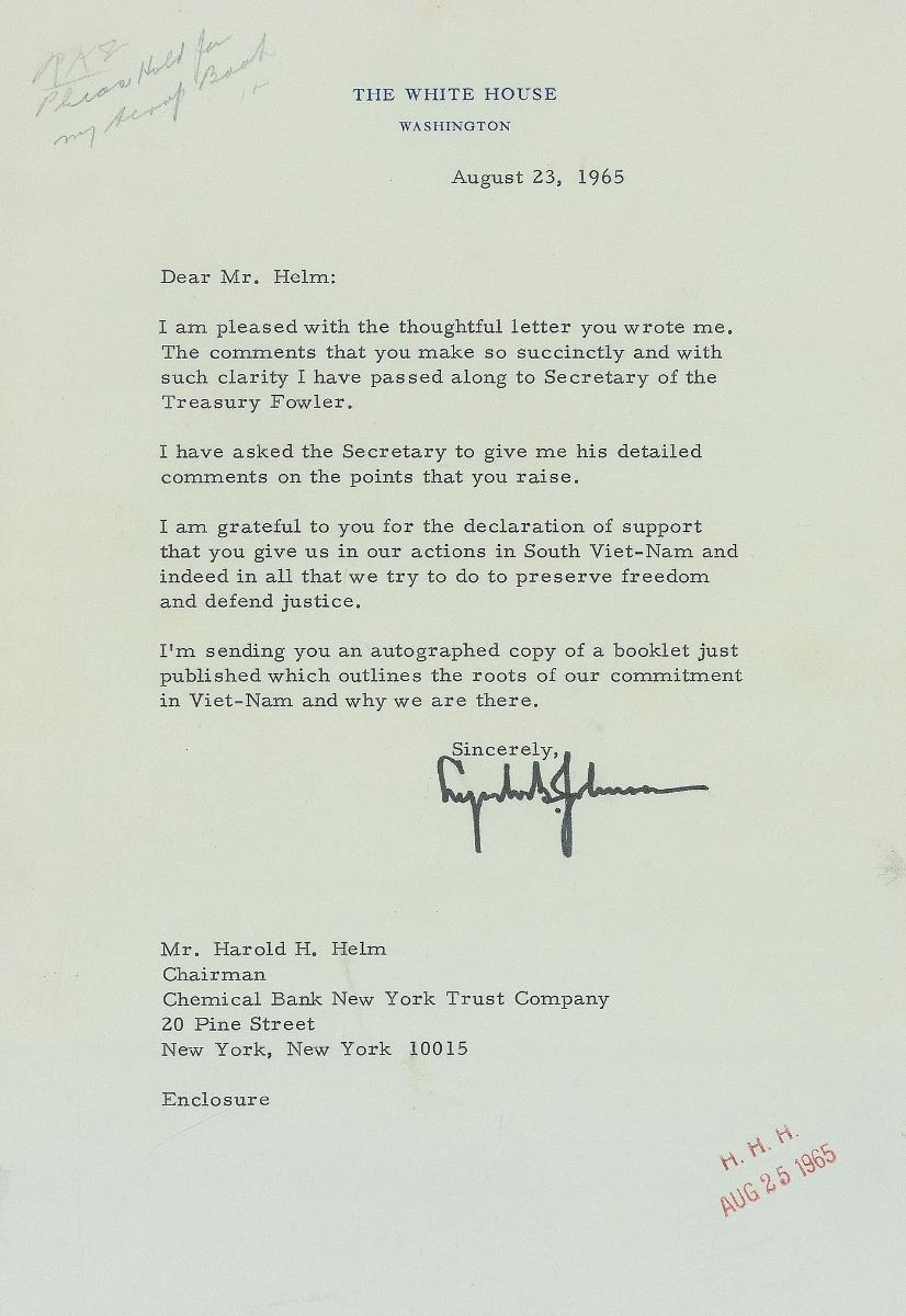 Fantastic TLS as president, one page, 7 x 10.25, White House letterhead, August 23, 1965. Letter to Harold H. Helm, chairman of the Chemical Bank New York Trust Company. In part: “I am grateful to you for the declaration of support that you give us in our actions in South Viet-Nam and indeed all that we try to do to preserve freedom and defend justice.” In fine condition, with light soiling and office stamps and notations. Accompanied by a retained carbon copy of Helms’s initial letter and a telegram inviting him to a White House luncheon. Excellent content.