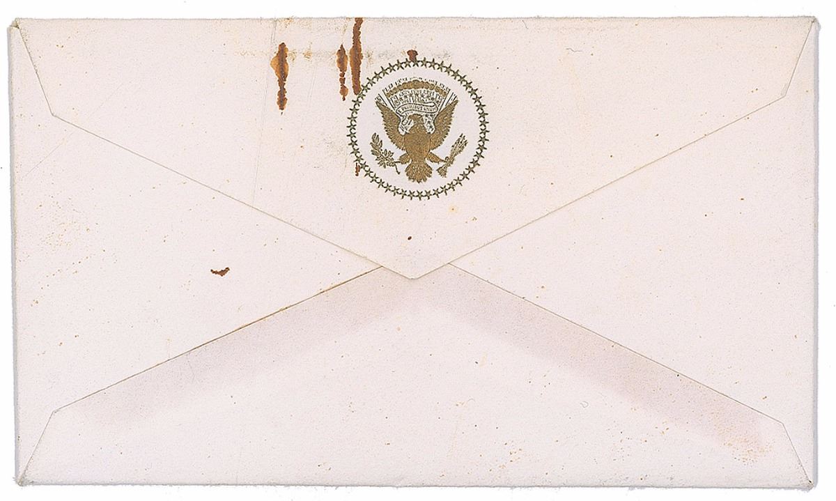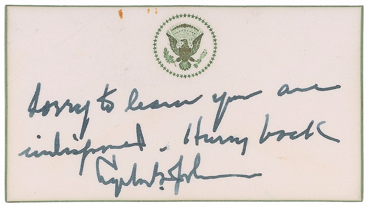 Scarce ANS signed “Lyndon B. Johnson,” one page on a 4.25 x 2.25 stationery card embossed with the presidential seal, no date. Brief note offering good wishes. In full: “Sorry to hear you are indisposed. Hurry back.” In very good condition, with oxidation to the gilt-stamped seal and gilt edges, and traces of a rusty paperclip mark to the top. Accompanied by the original transmittal envelope, which bears a matching embossed seal on the flap.