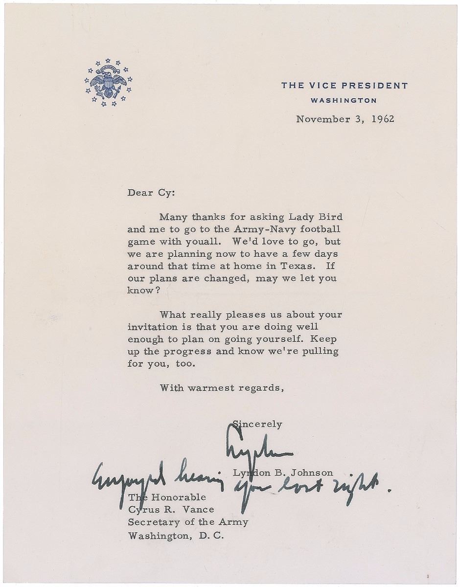 TLS signed “Lyndon,” one page, 7 x 9, vice presidential letterhead, November 3, 1962. Letter to Secretary of the Army Cyrus R. Vance. In part: “Many thanks for asking Lady Bird and me to go to the Army-Navy football game with you all. We’d love to go, but we are planning now to have a few days around that time at home in Texas…What really pleases us about your invitation is that you are doing well enough to plan on going yourself. Keep up the progress and know we’re pulling for you, too.” Johnson adds a short handwritten postscript, “Enjoyed hearing you last night.” In fine condition. Accompanied by the original 224–page program for the game, which depicts President Kennedy and a copy of a letter he sent to both teams wishing them good luck; although Johnson declined this invitation, Kennedy did attend. Navy defeated Army with a score of 34–14, their fourth consecutive victory in the anticipated annual matchup.