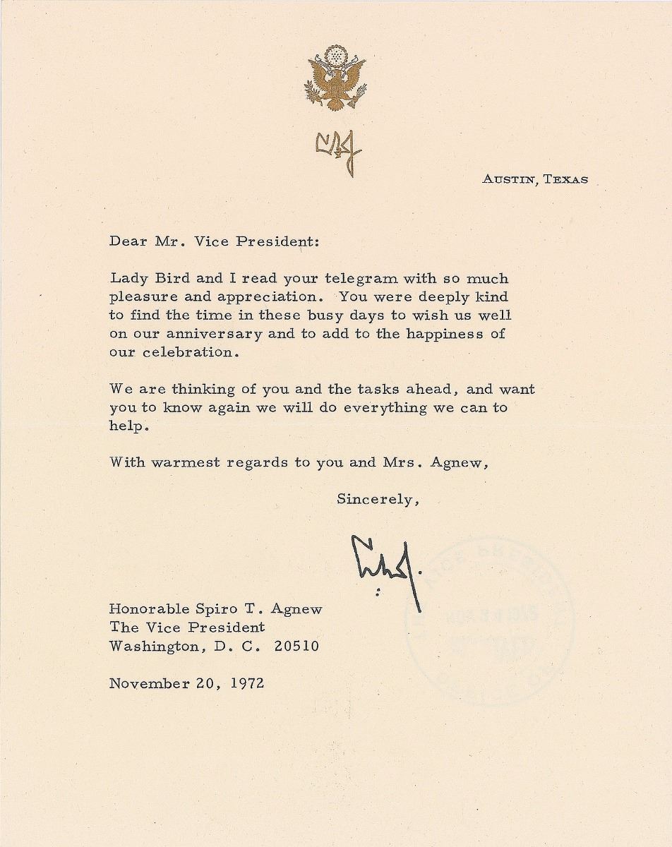 TLS signed “L. B. J.,” one page, 7 x 8.75, personal letterhead, November 20, 1972. Letter to Vice President Spiro T. Agnew, written shortly after the Nixon-Agnew ticket decisively won their second term in the 1972 election. In part: “You were deeply kind to find the time in these busy days to wish us well on our anniversary and to add to the happiness of our celebration. We are thinking of you and the tasks ahead, and want you to know again we will do everything we can to help.” In fine condition. Accompanied by an unsigned telegram sent by Johnson the day after the election congratulating Agnew on his victory. Originates from the personal estate of Spiro Agnew.