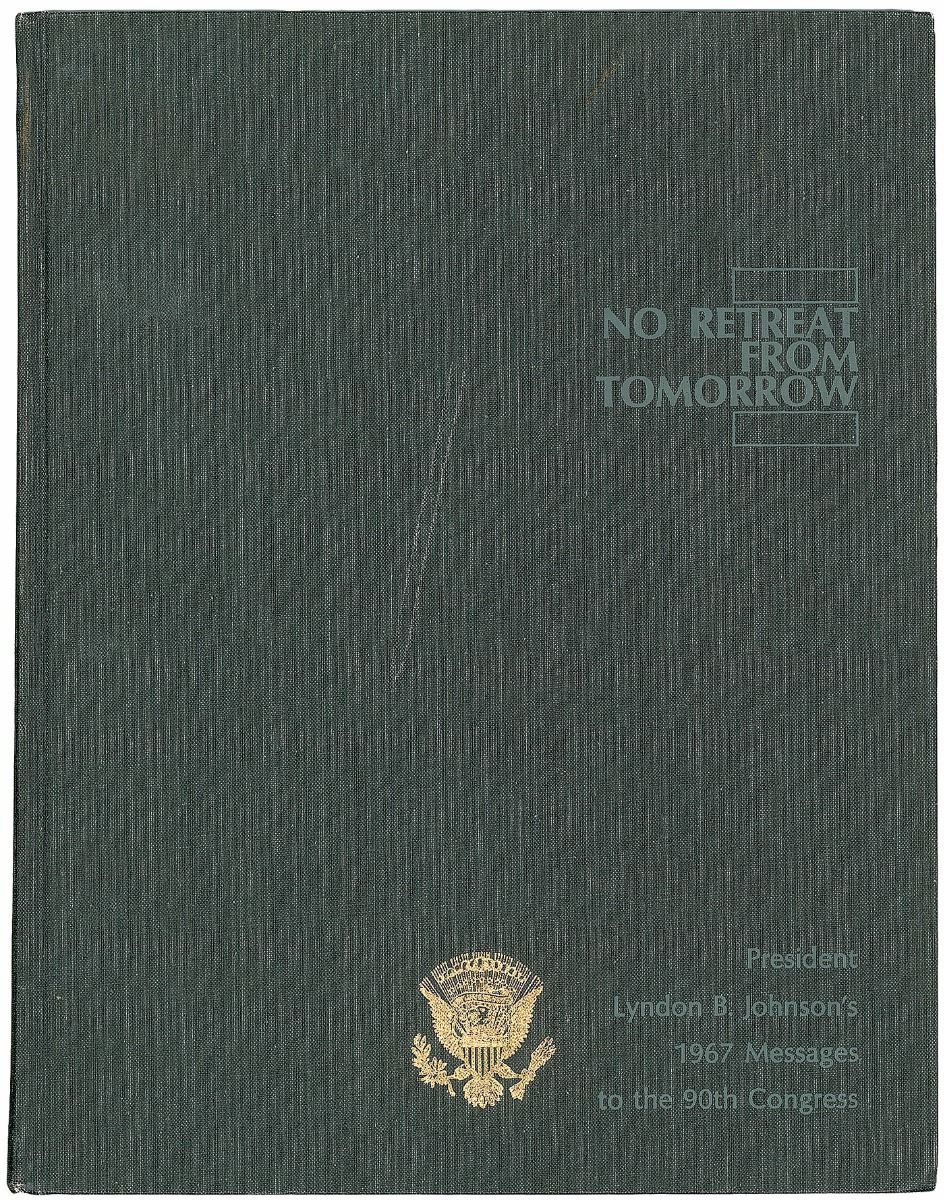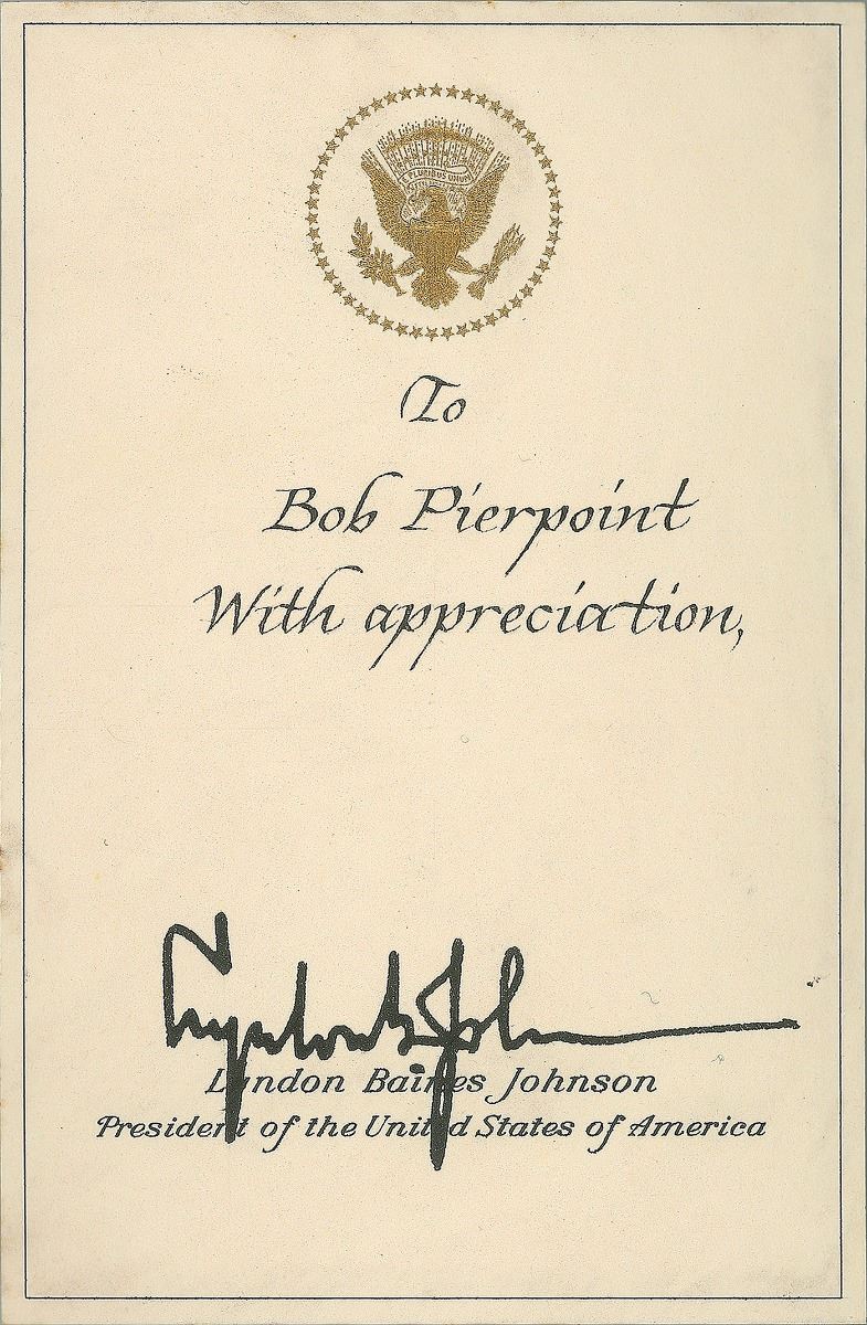 Personal embossed bookplate bearing the presidential crest, 3.25 x 4.75, calligraphically inscribed in black ink, “To Bob Pierpoint, with appreciation,“ and signed in black felt tip, “Lyndon B. Johnson.” Includes a hardcover copy of No Retreat From Tomorrow. In fine condition. Pierpoint covered six presidential administrations, from Eisenhower to Carter, as a White House correspondent for CBS.