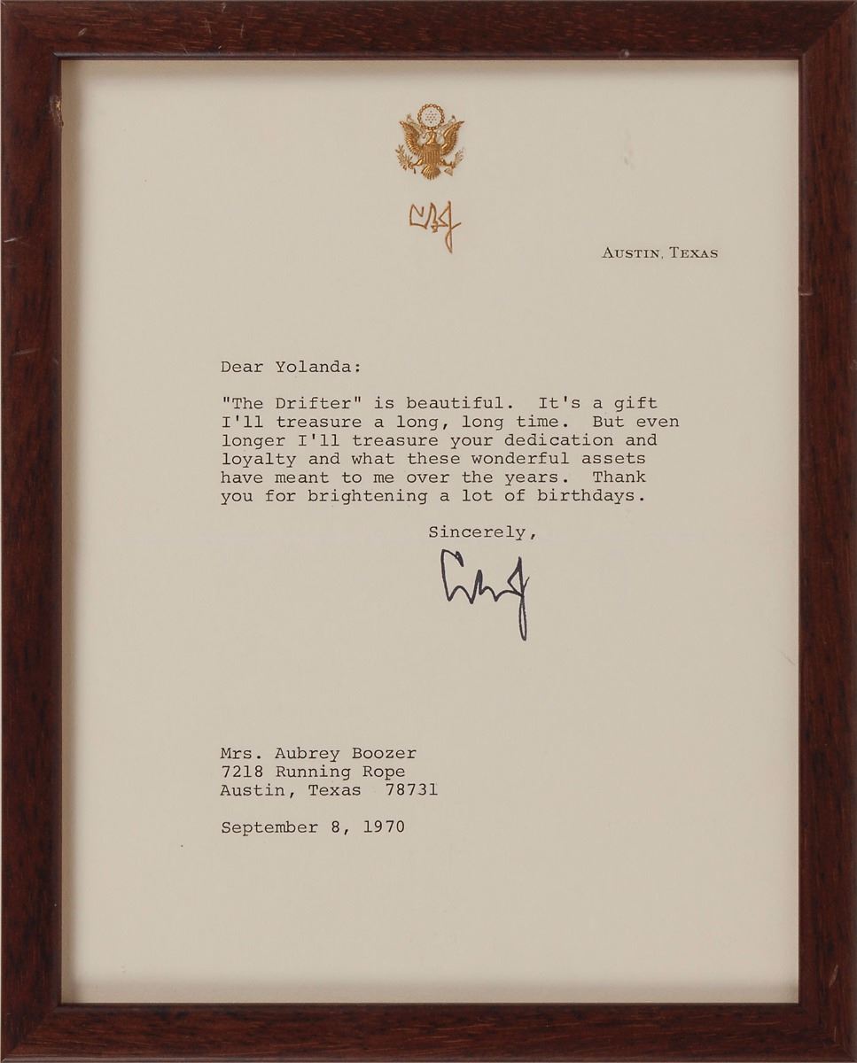 TLS signed “LBJ,” one page, 7 x 8.75, personal letterhead, September 8, 1970. Letter of thanks for a gift, in full: “‘The Drifter’ is beautiful. It’s a gift I’ll treasure a long, long time. But even longer I’ll treasure your dedication and loyalty and what these wonderful assets have meant to me over the years. Thank you for brightening a lot of birthdays.” Framed and in fine condition.