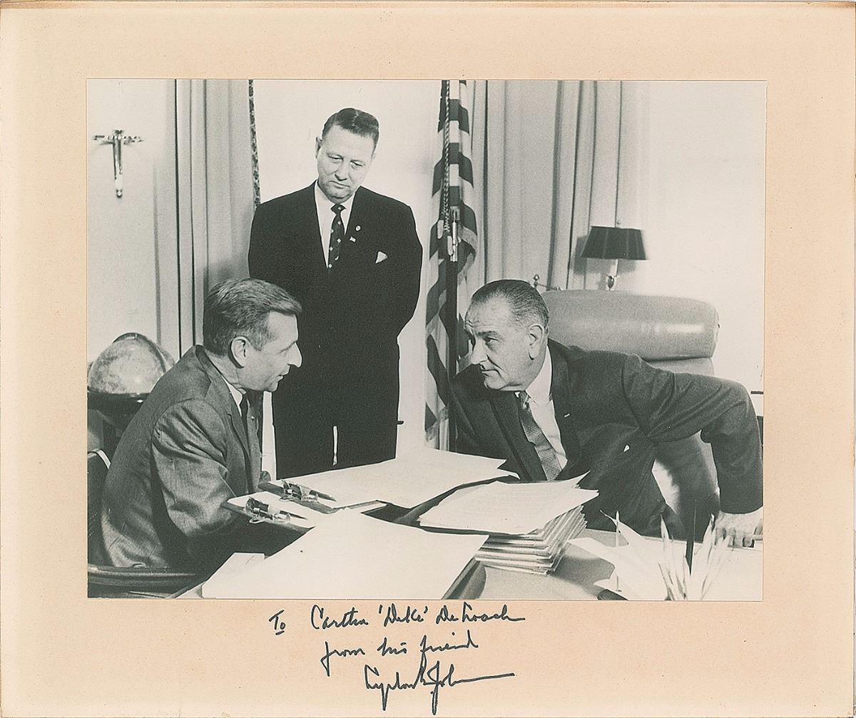 Matte-finish 8.75 x 6.75 photo of President Johnson with Deke DeLoach and another gentleman in the Oval Office, affixed to its original 11 x 9.25 mat, signed and inscribed on the mat in black felt tip, “To Carlton ‘Deke’ DeLoach, from his friend, Lyndon B. Johnson.” In fine condition, with light overall rippling. Deke DeLoach worked at the FBI for nearly thirty years and, in 1965, was promoted by Hoover to the lofty position of Deputy Director. During his tenure, DeLoach was a lead investigator in both the Kennedy and Martin Luther King, Jr., assassinations.