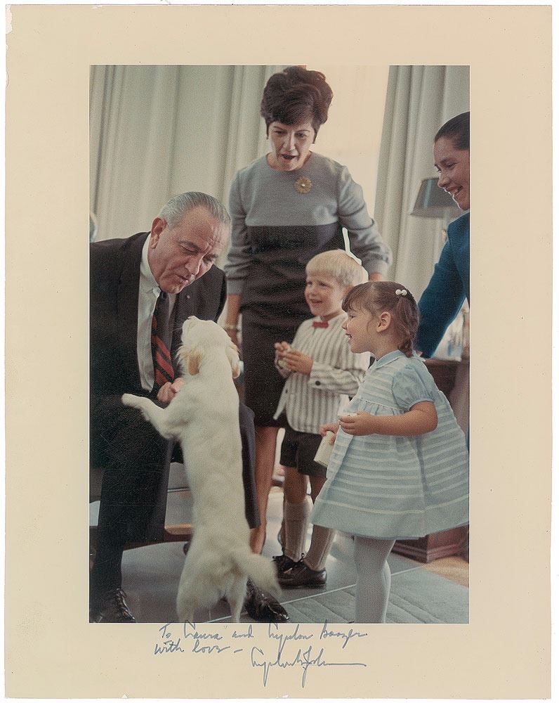 Color semi-glossy 11 x 14 photo of Johnson with two young children and a precious puppy, signed and inscribed in the lower border in ink, “To Laura and Lyndon Boozer, with love—Lyndon B. Johnson.” In fine condition, with scattered surface scuffing.