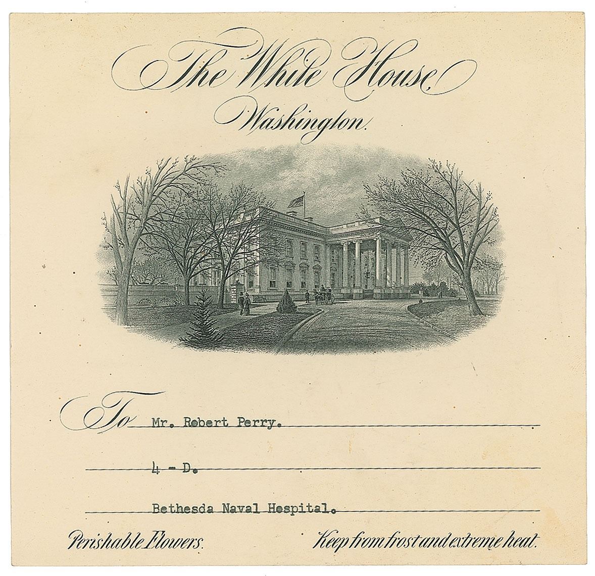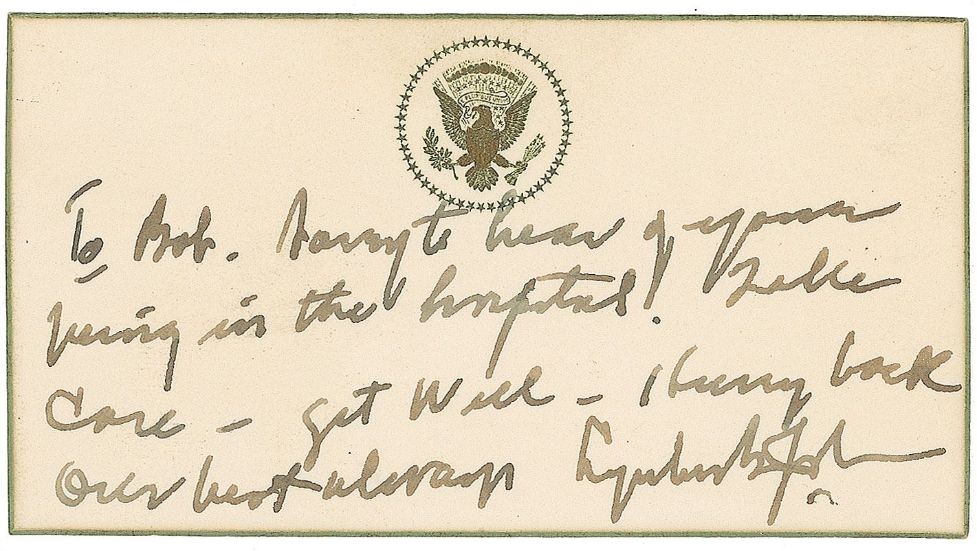 Rare ANS as president on an official 4 x 2.25 card embossed with the presidential seal, no date. Note to Robert Perry in Bethesda Naval Hospital. In full: “To Bob—Sorry to hear of your going in the hospital! Take care—get well—Hurry back—Our best always, Lyndon B. Johnson.” In fine condition. Accompanied by the official White House transmittal slip addressed in type to Perry at the hospital as well as the original envelope for the card bearing the same embossed presidential seal on the flap. Provenance: The Everett Fisher Collection.