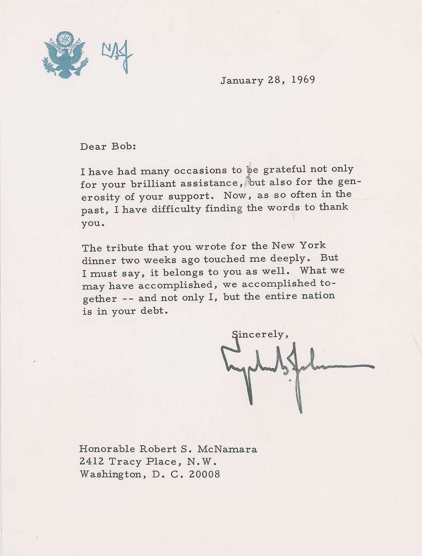 TLS, one page, 6.25 x 8.5, personal letterhead, January 28, 1969. Letter to former Secretary of Defense Robert S. McNamara, in full: "I have had many occasions to be grateful not only for your brilliant assistance, but also for the generosity of your support. Now, as so often in the past, I have difficulty finding the words to thank you. The tribute that you wrote for the New York dinner two weeks ago touched me deeply. But I must say, it belongs to you as well. What we may have accomplished, we accomplished together—and not only I, but the entire nation is in your debt." In fine condition, with trivial smudging.