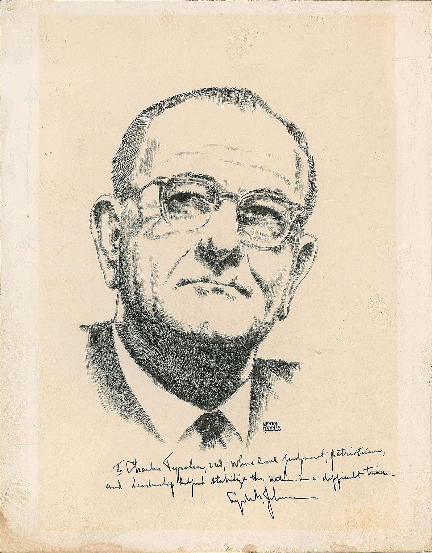 Terrific 10.75 x 14 original ink portrait sketch of Lyndon B. Johnson by artist Nanton Romney, signed and inscribed in black ink, "To Charles Tyroler, 2nd, whose cool judgment, patriotism, and leadership helped stabilize the nation in a difficult time—Lyndon B. Johnson." Also signed below by the artist in black ink. In fine condition, with a light block of toning from prior display, and some staining to the bottom edge which could easily be matted out again. Tyroler was a longtime Democratic Party strategist who went on to serve as a member of the President's Intelligence Oversight Board during the Reagan and Bush administrations; he was active in the presidential campaigns of John F. Kennedy in 1960, and Lyndon B. Johnson in 1964. An impressive likeness of the 36th president with a lengthy and noteworthy inscription.